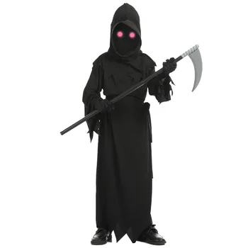 Hign-concerned Chemical: None Department Name: Children Theme: Grim Reaper Material: POLYESTER Gender: Unisex Origin: Mainland China CN: Zhejiang Special Use: costumes Crowd: Child/Boy/girl Scenes: Halloween/Christmas/Carnival/Holiday Party Purchase Includes:Grim Reaper Costume + Hat + Belt + Sickle + Chain + Red Glasses