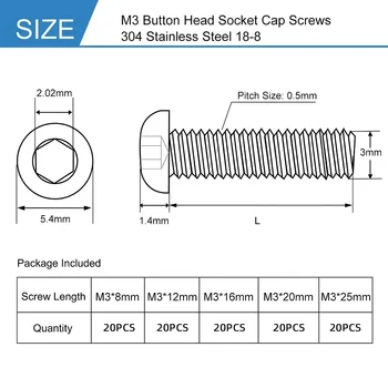 Hign-concerned Chemical: None Dimensions: M3*8 DIY Supplies: Metalworking Model Number: M3 x 8mm 12mm 16mm 20mm 25mm Material: Stainless Steel Origin: Mainland China Material: 304 stainless steel material, with high corrosion resistance and chemical resistance, moisture resistance and durable. Thread Diameter: 3 mm; Pitch Size: 0.5 mm, Thread Length: 8 mm, 12 mm, 16 mm, 20 mm, 25 mm. Head Diameter:…