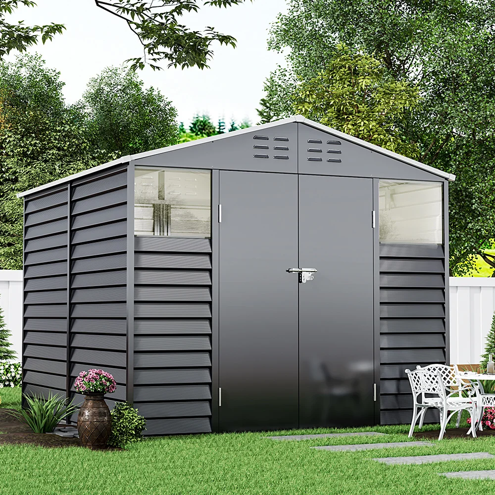 Maximize your gardening efficiency with this high-quality charcoal steel tool shed. The shed features two front windows, allowing natural light to flood the interior, creating a welcoming and functional workspace. The strategically placed vents ensure proper air circulation, preventing condensation and maintaining an optimal environment for your tools and supplies. With built-in shelves, you can keep your gardening essentials organized and easily accessible. This spacious shed offers ample room for storing larger equipment, pots, bags of soil, and more.