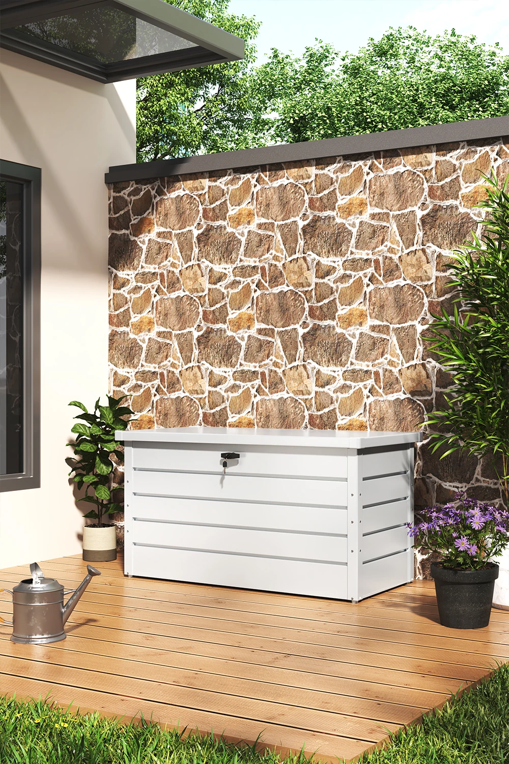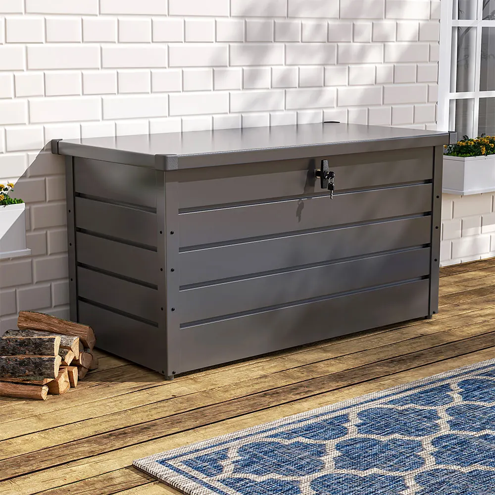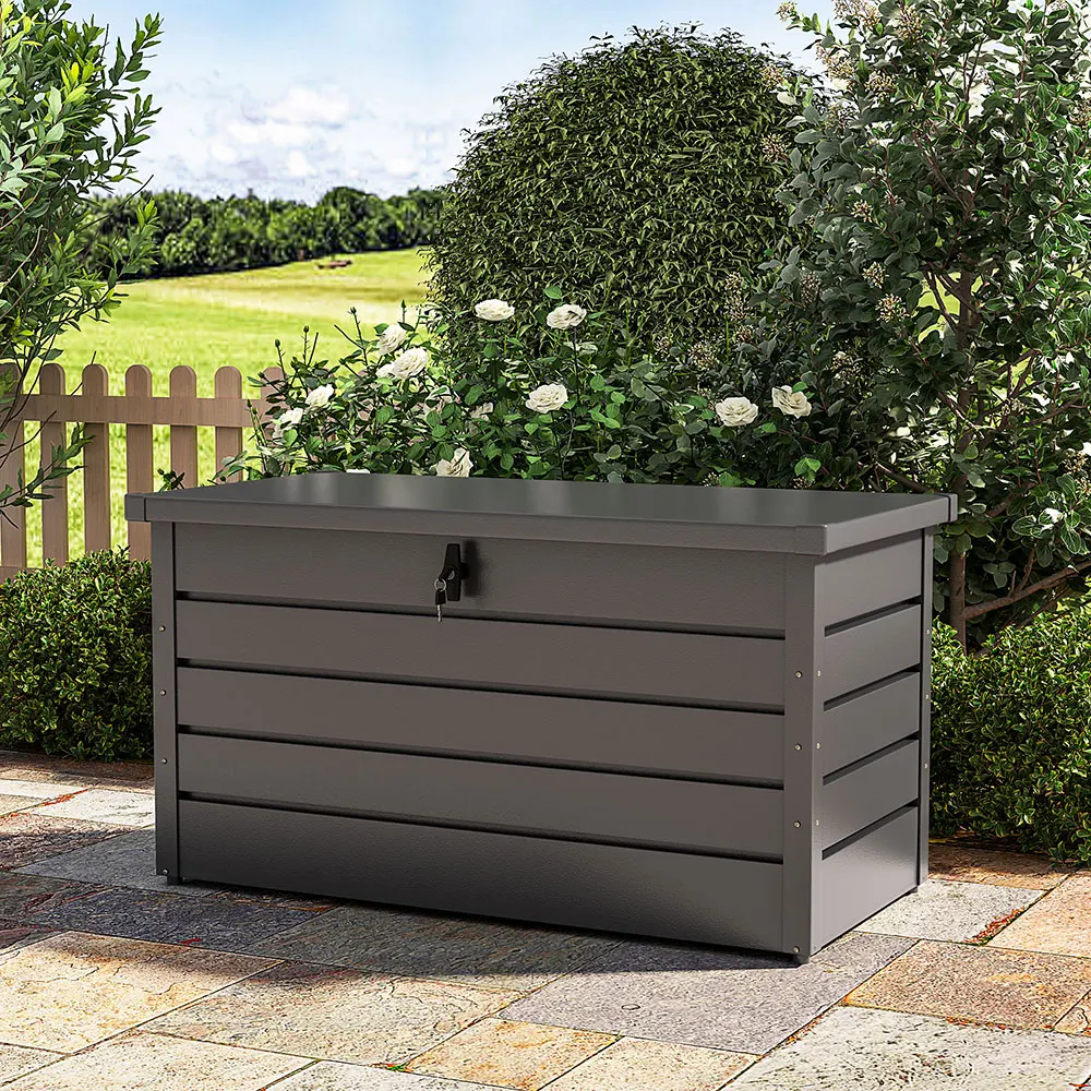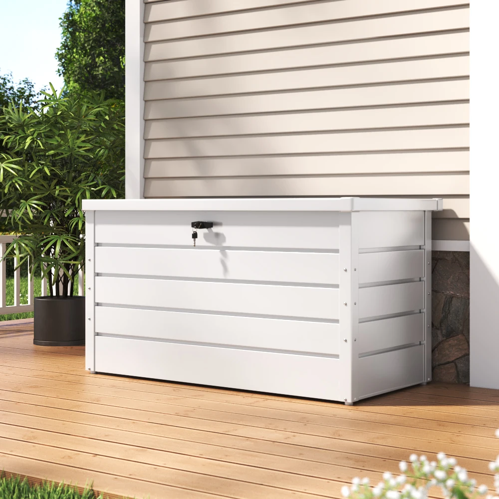 This is a solid box with a large storage capacity. It stands out for its robust galvanized steel material. Thanks to it, the storage cabinet is very durable and can withstand bad weather conditions. What’s more, it is easy to maintain as well. You can be relieved because your garden tools can be preserved unharmed inside the box with an attached lock.