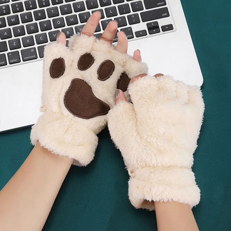 1 Pair Women Cartoon Cat Claw Gloves Thicken Fingerless Soft Plush Warm Cute Bear Paw Fingers Winter Kawaii Half Finger Mittens