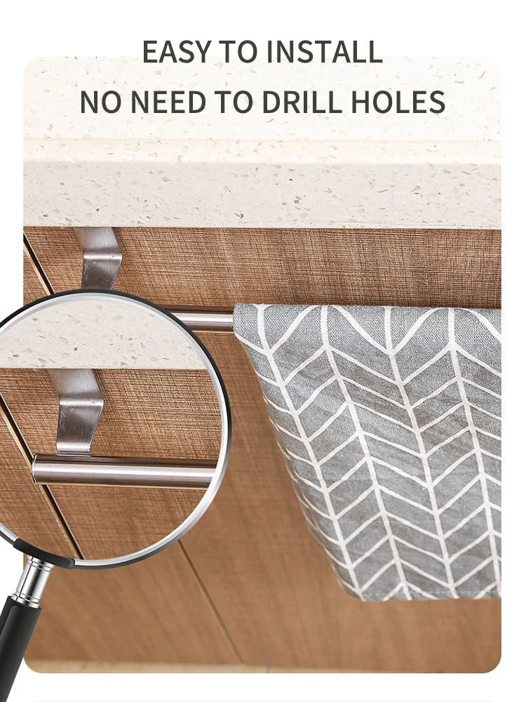 Instant towel bar in the kitchen – Save even more space by keeping kitchen towels within hand reach with this towel rack. Suitable for kitchen, bathroom, garage and even office cabinet doors. You can easily eliminate clutter on your kitchen counter and have easy access to these towels.