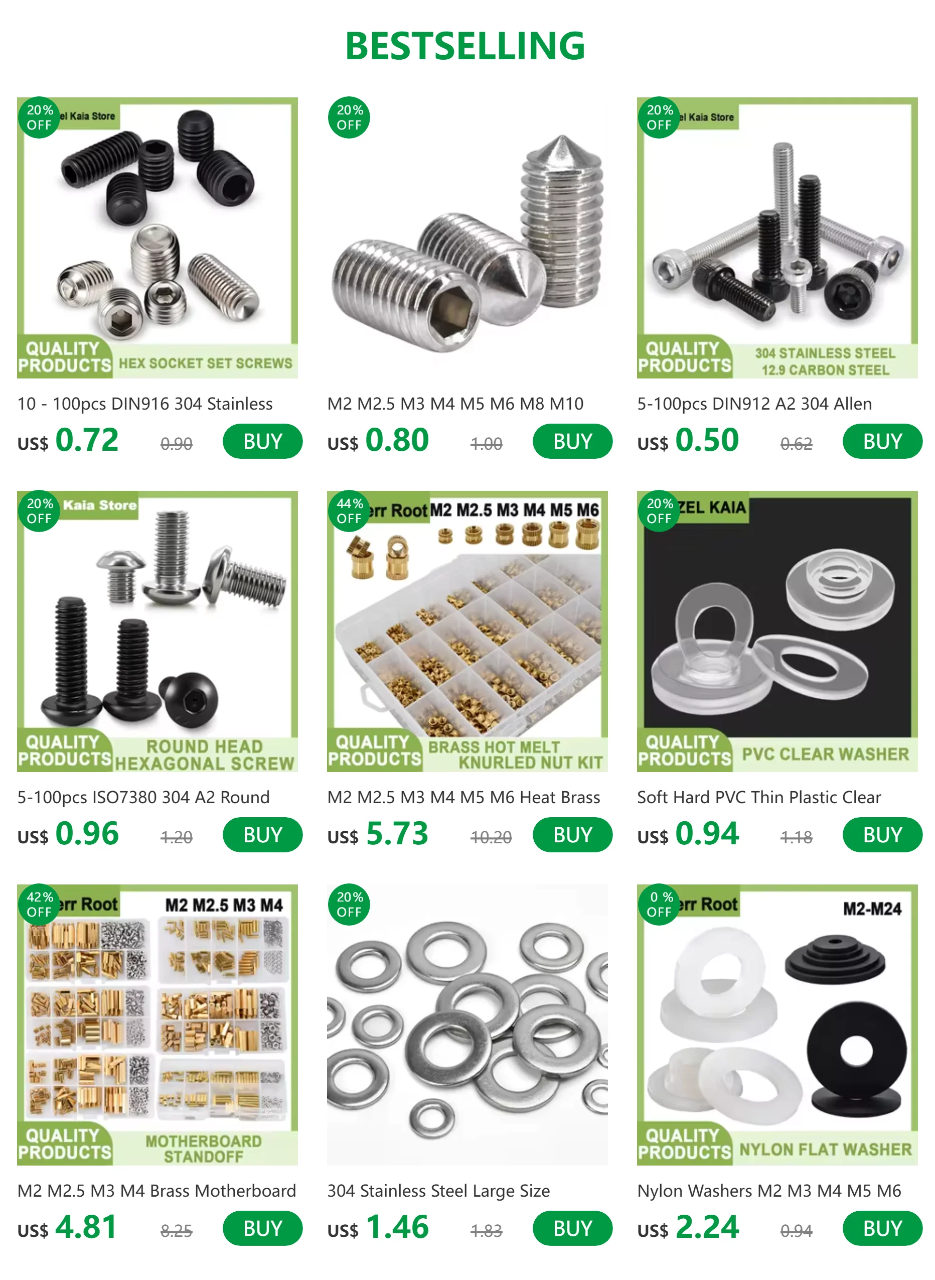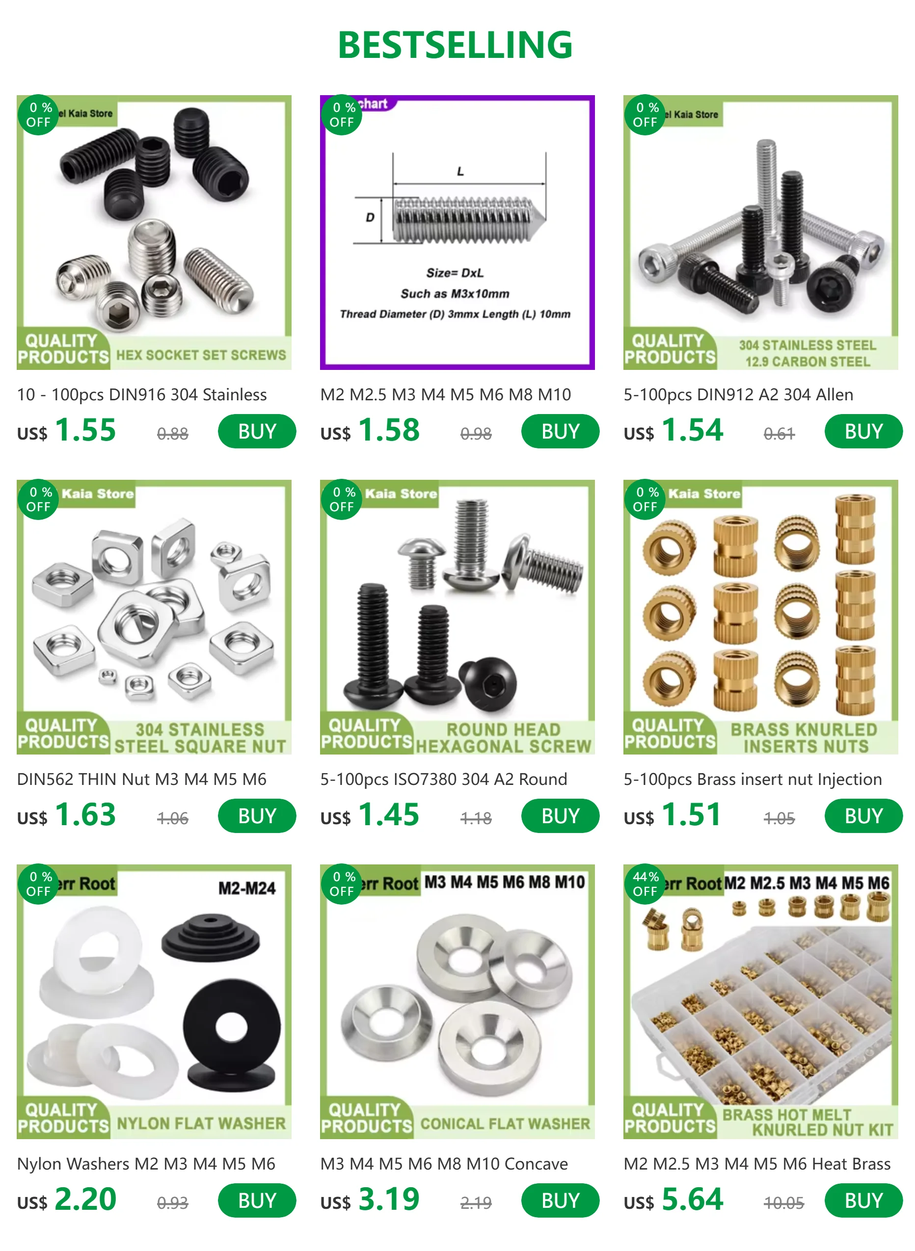 | Size | M1.6 (50pcs), M2 (50pcs), M2.5 (50pcs), M3 (100pcs), M3.5 (100pcs), M4 (100pcs), M5 (50pcs), M6 (50pcs), M8 (10pcs) |