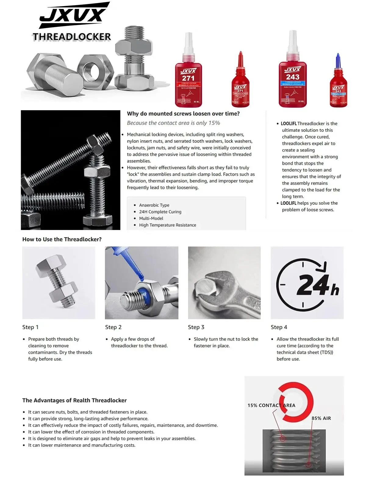 4. This product works better with a thin adhesive layer below 0.05mm. For oversize threads, a large gap can affect the curing speed and strength of the product.