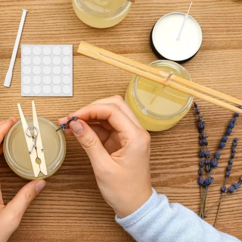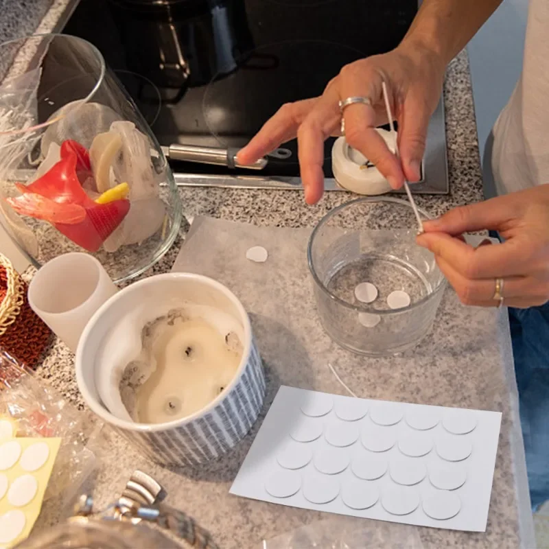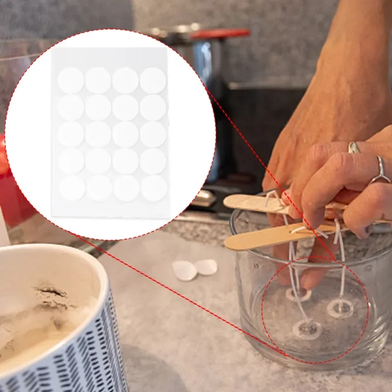 Place them on the bottom of the wick and adhere your wick to the bottom of the jar, put it for two hours and then pour wax water, easy to keep the wick centered, making your DIY candle more convenient and easy.