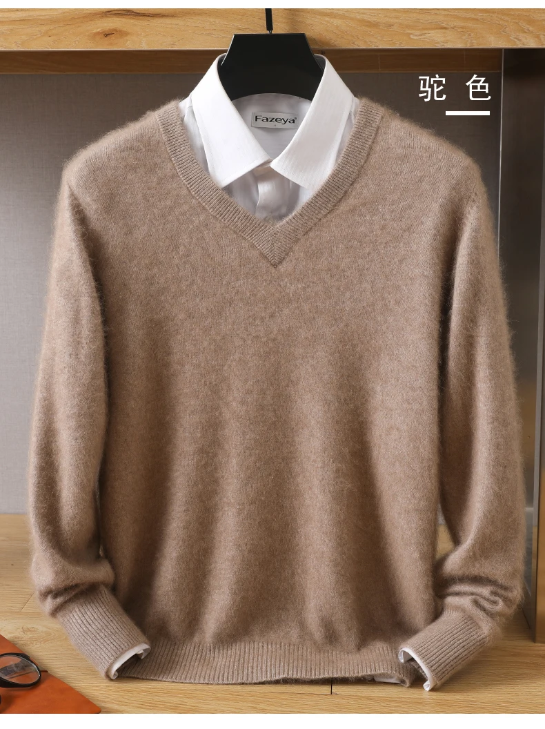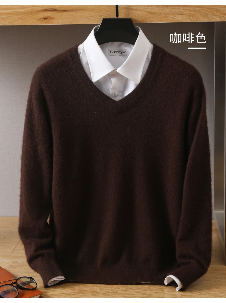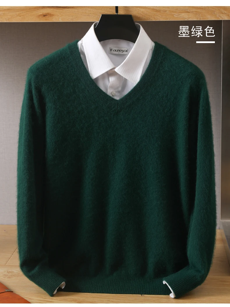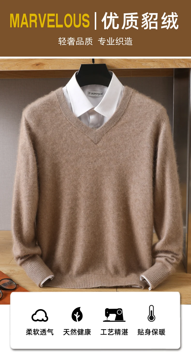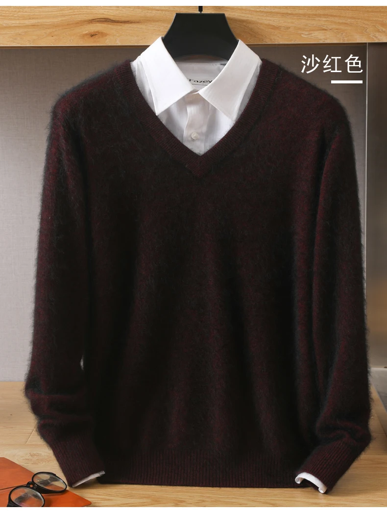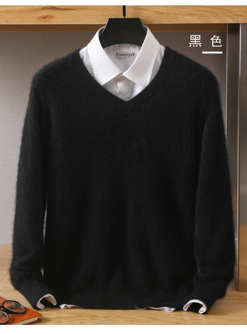 100% Pure Mink Cashmere Sweater Men’s V-Neck Pullovers Knit Large Size Mink Sweater Winter New Long Sleeve High-End Jumpers Tops