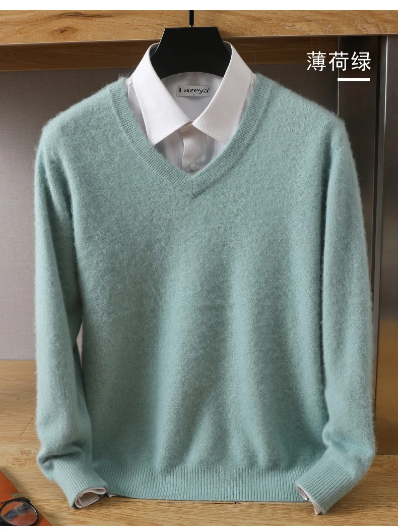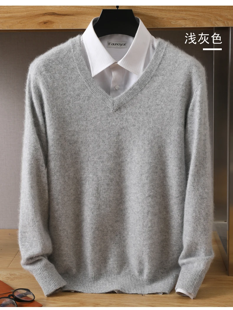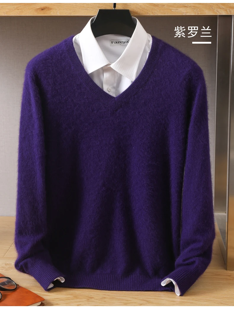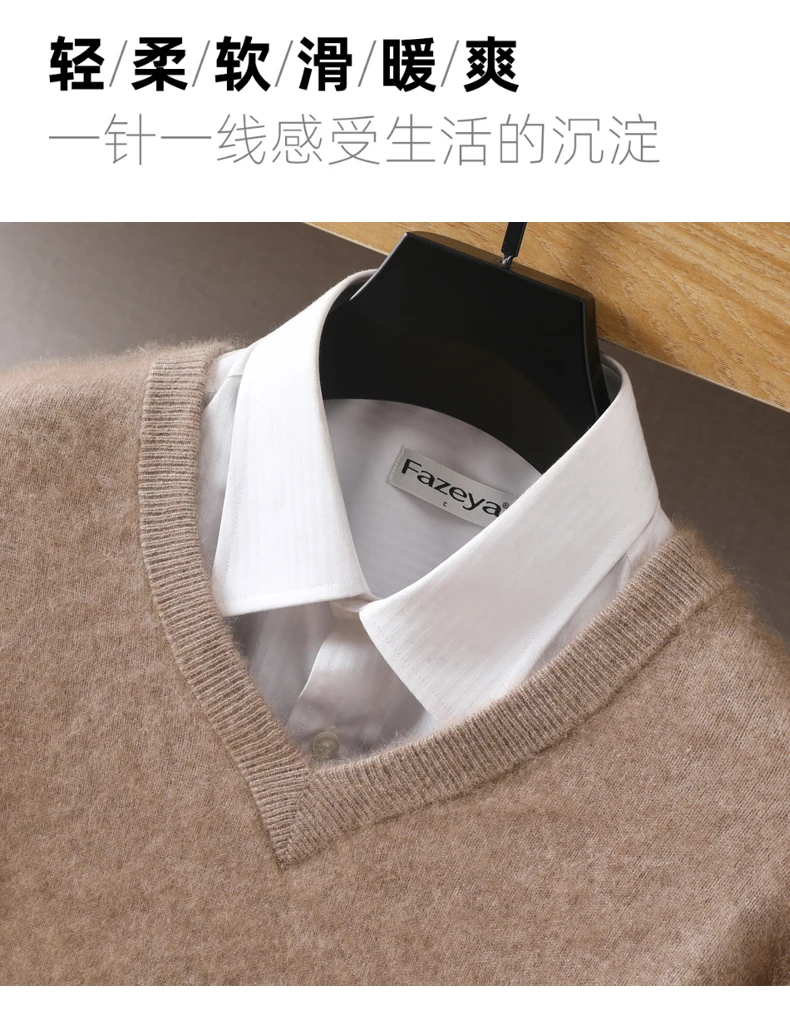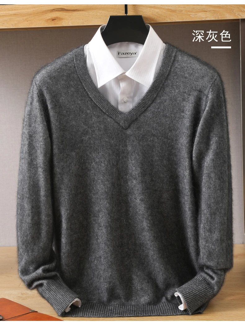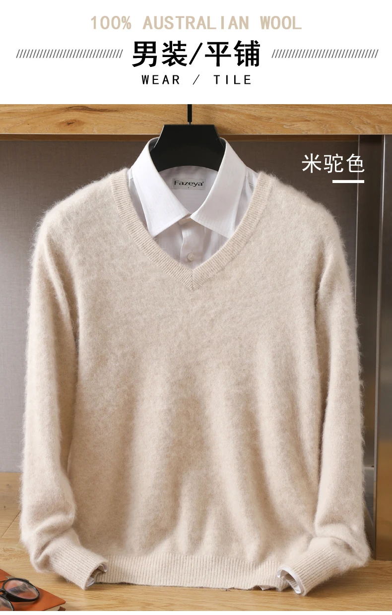 100% Pure Mink Cashmere Sweater Men’s V-Neck Pullovers Knit Large Size Mink Sweater Winter New Long Sleeve High-End Jumpers Tops