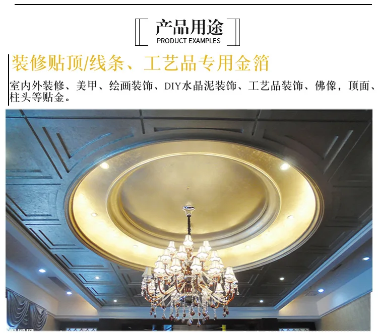 Use: Gold foil three-dimensional, plane, relief painting, gold book production signs gold, crafts gold, decoration gold and other indoor and outdoor decoration gold foil project: temple gold, Buddha;Hotel, nightclub, ceiling, furniture line stick and home interior and exterior walls, top surface, stigma, Roman column, Mosaic, etc.