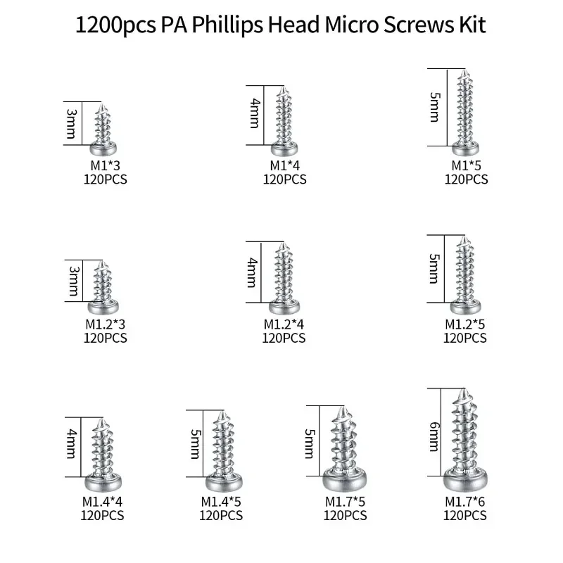 1200Pcs Mini Self-Tapping Electronic Screws kit DIY Sunglasses Watch Repair Screws with Tweezers M1/M1.2/M1.4/M1.7