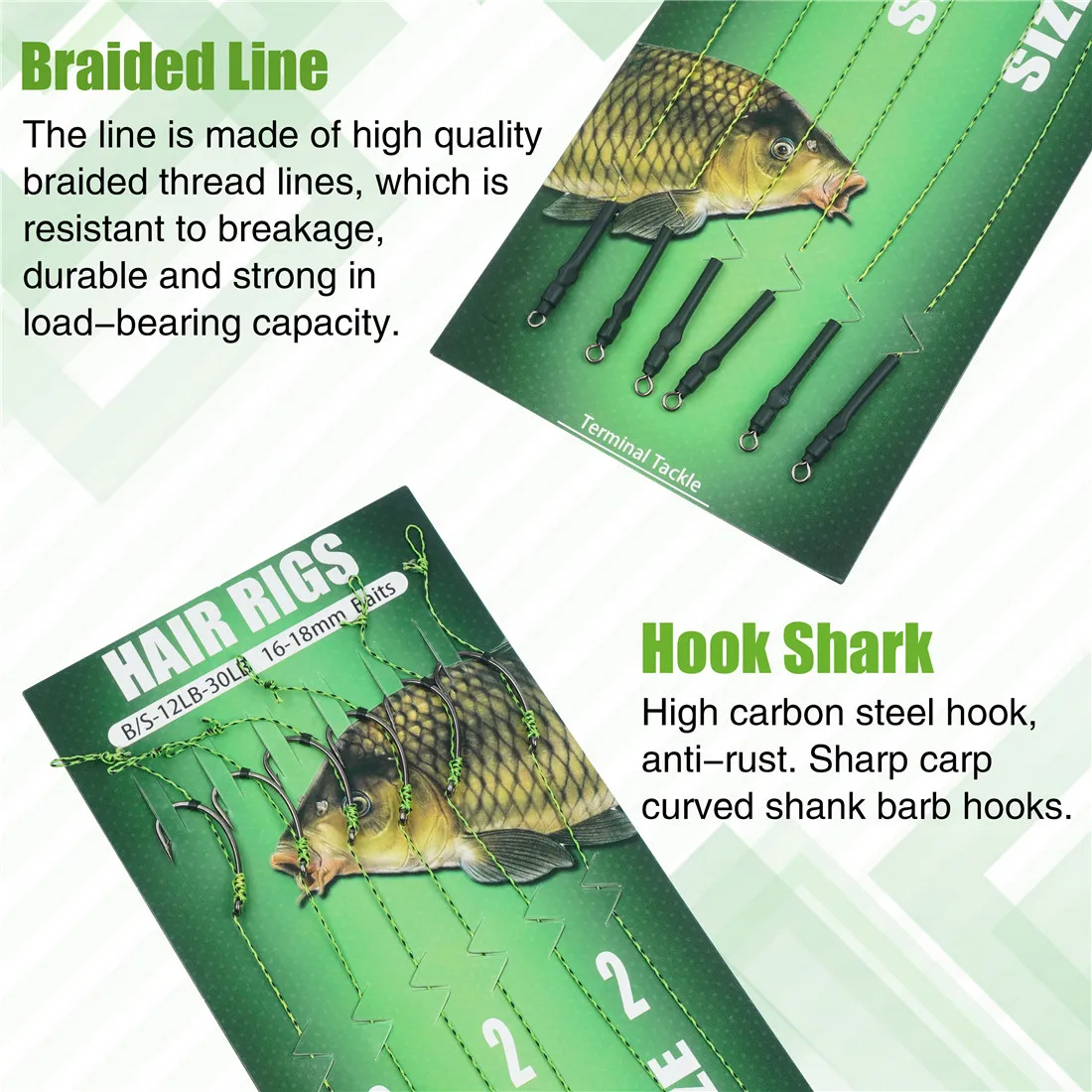 - Quantity: 12Pcs=2Packs (1Pack include 6Pcs carp tied hair rigs)