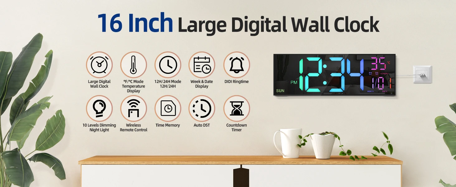 【👍LARGE LED DISPLAY, EASY READ】𝐋𝐄𝐈𝐊𝐄 digital wall clock with 16 inches large colorful display and 4.5 inch clear jumbo digits, allow you to read clearly from a great distance or any angles. Especially user friendly for the elderly. It’s also a nice decorative digital clock wall stuff for your room.