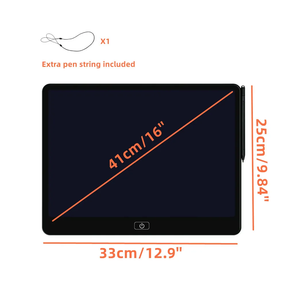 The 16-inch writing board is a practical and convenient tool that offers a range of features for a seamless writing experience. With its one-click erasure functionality, you can easily remove all content with a simple press, allowing for effortless reuse. The replaceable battery ensures uninterrupted usage, eliminating the worry of running out of power. The clear and legible writing makes it easy to read and convey your messages precisely. What's more, this writing board comes with an additional free pen line, enhancing its usability. Measuring 16 inches, this writing board provides a spacious area for you to freely express your thoughts and ideas. Whether it's taking notes, doodling, or brainstorming, this versatile tool is designed to meet your various writing needs. Its portability makes it ideal for on-the-go use, whether in the classroom, office, or while traveling. The 16-inch writing board is not only functional but also offers durability and ease of use, making it a valuable addition to your writing arsenal.