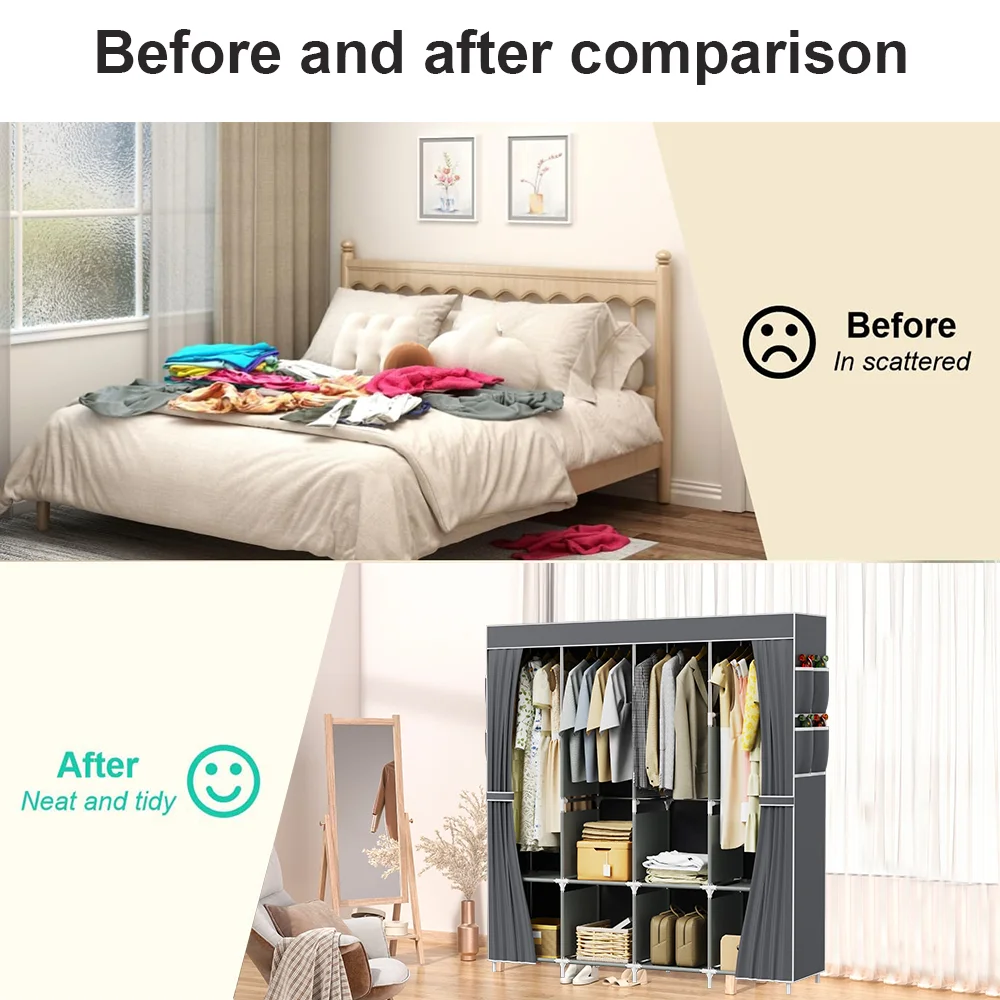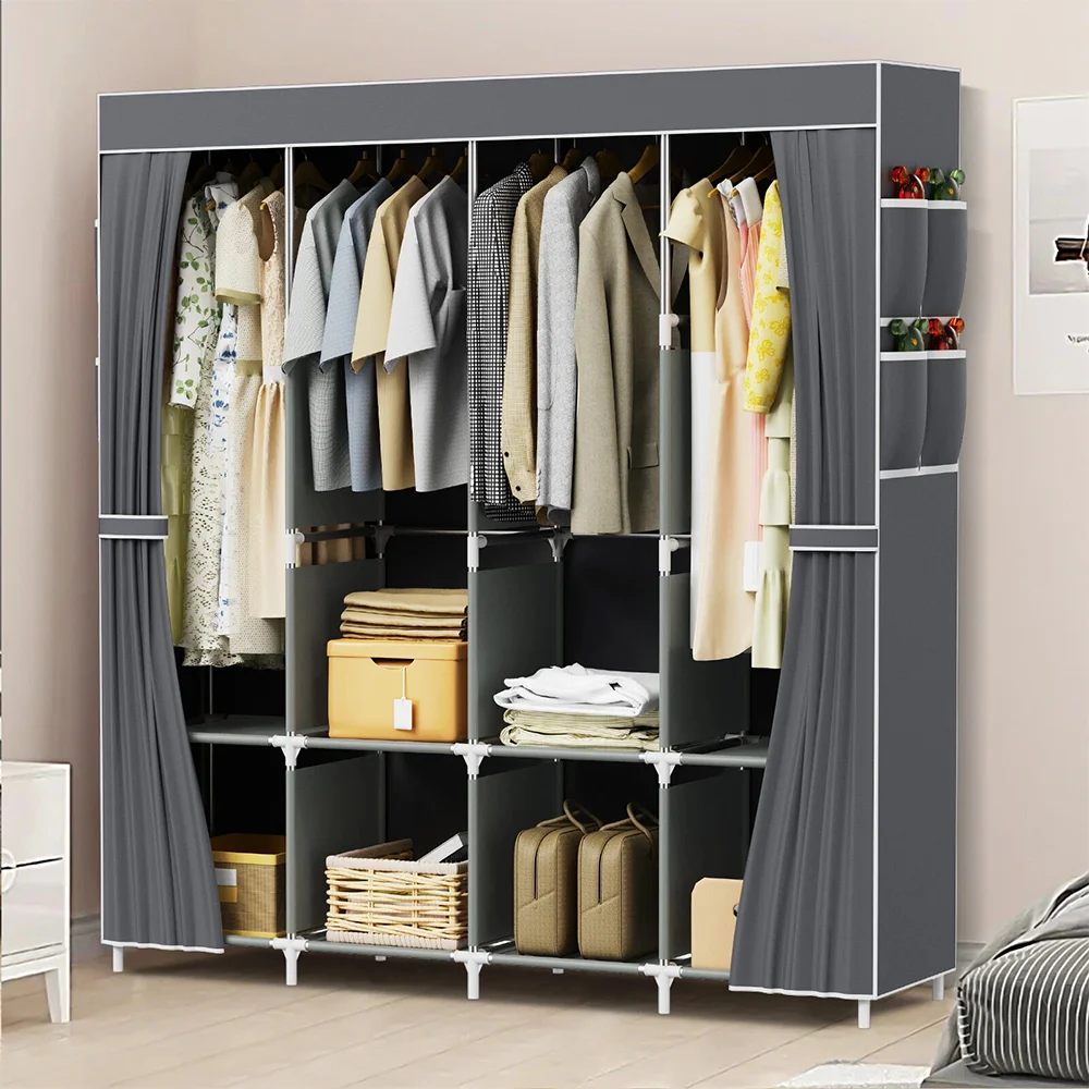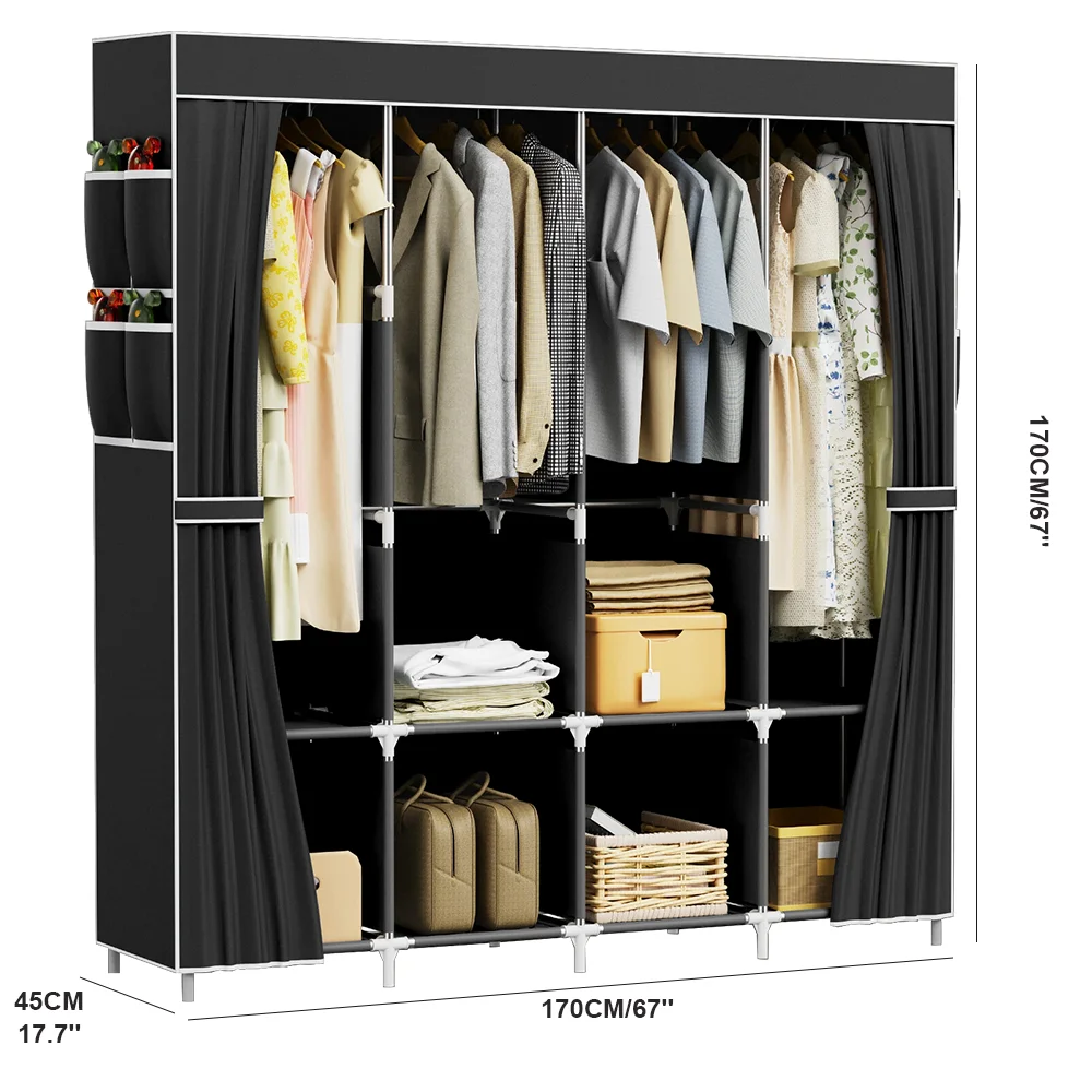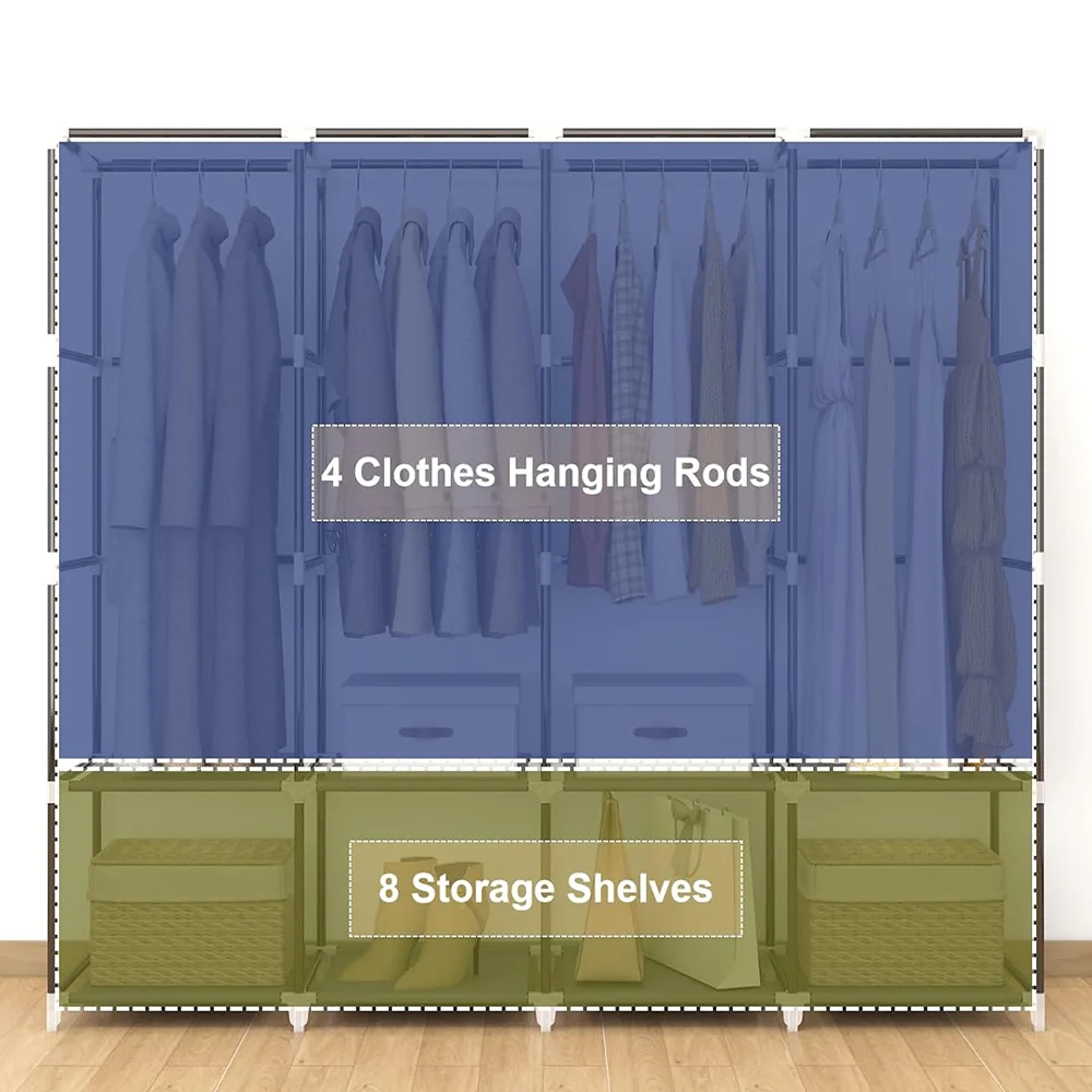 Features 4 storage pockets on both sides, 4 hanging rods, 4 hanging sections, and 4 folded clothing compartments;
