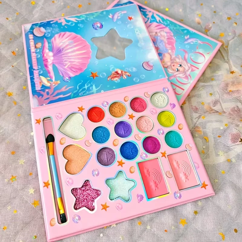 18-Color Children’s Makeup Set: This girls’ makeup set includes 12 eyeshadows, 2 blushes, 2 highlighters, 2 glitter powders, a double-ended makeup brush, and a mirror. The foldable magnetic storage design makes it convenient and organized, allowing little girls to easily apply makeup anytime, anywhere. Become the most dazzling little princess in the crowd!