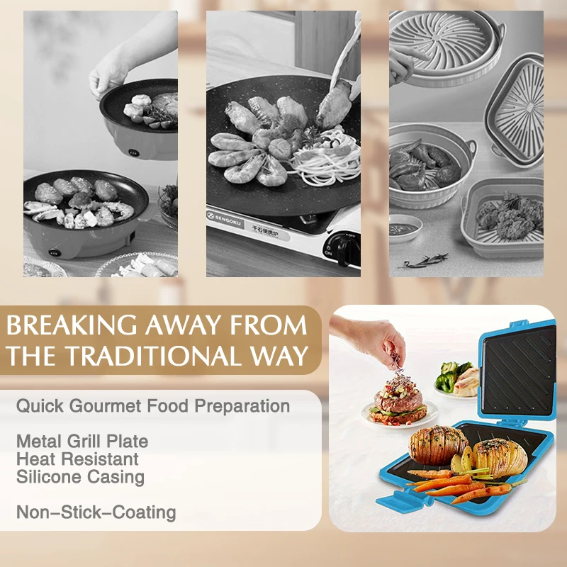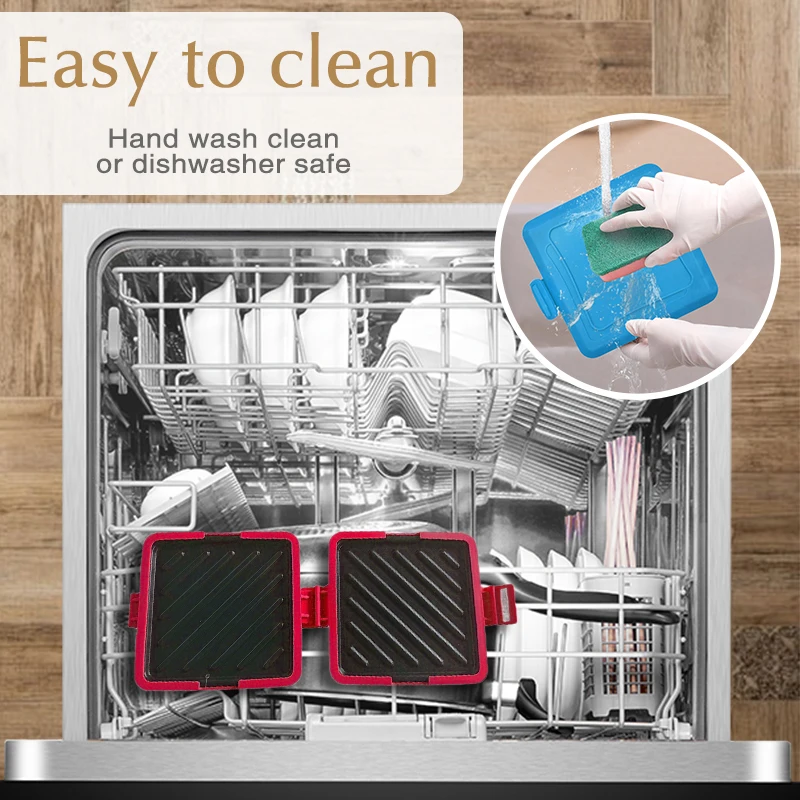 Features adjustable silicone straps to securely hold sandwiches, ensuring even cooking.