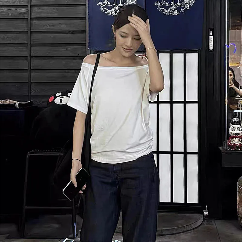 1pcs Summer Women Basic Model Solid Color T-Shirt Lady Short-Sleeved Skew Collar t-Shirt Female Street Style Sexy Slim Fit Tee