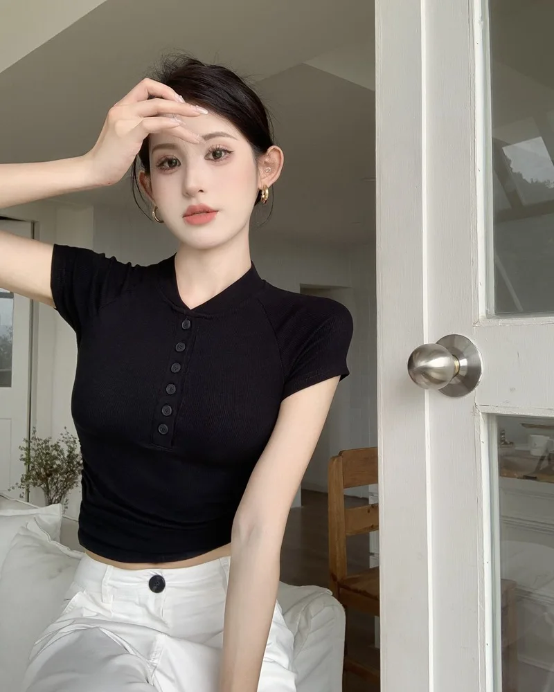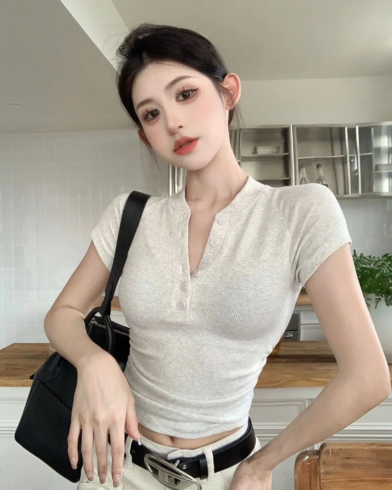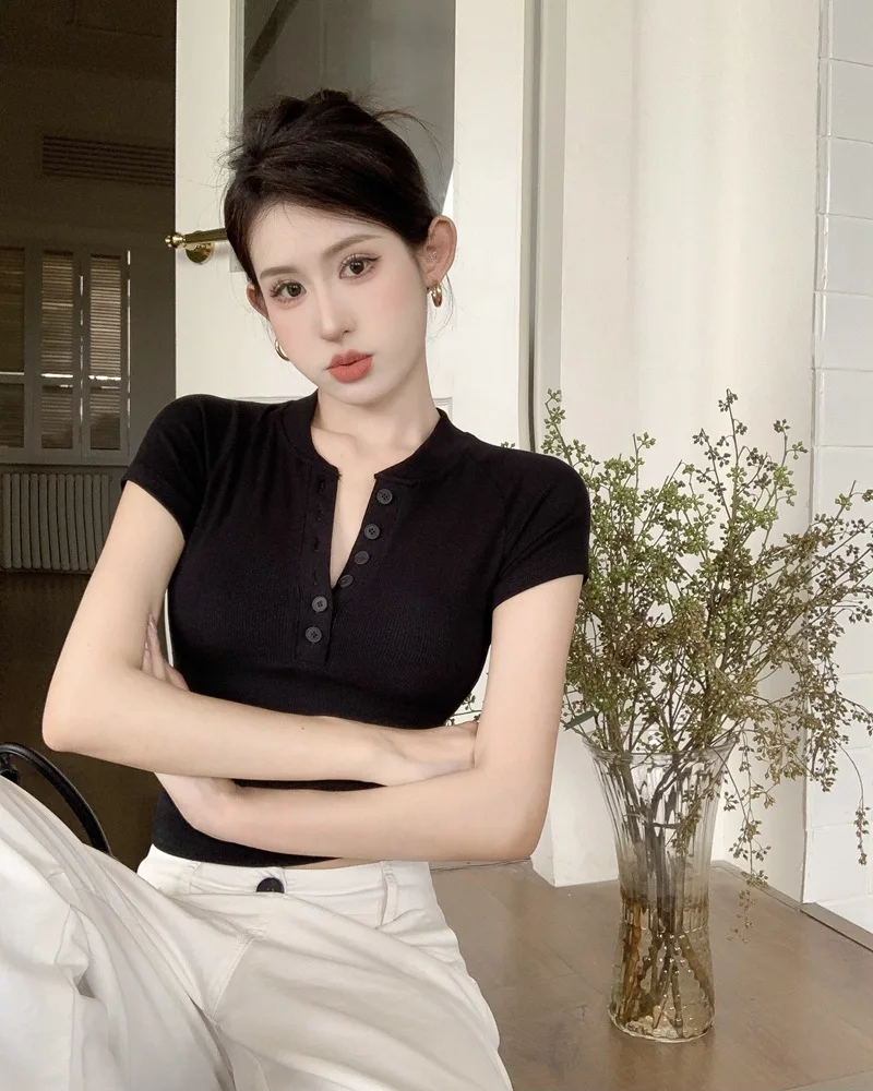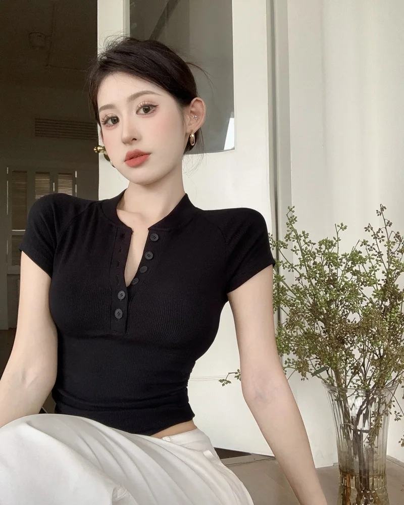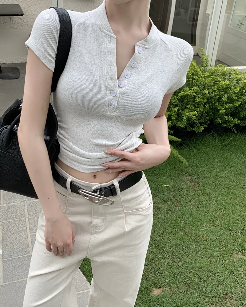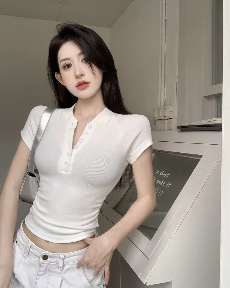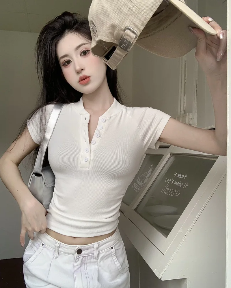 1pcs Summer Women T-shirt Girl Button Half Open Collar Tee Shirt Lady Short Sleeve Slim Fit Top Women’s Fashion Trend Casual Tee