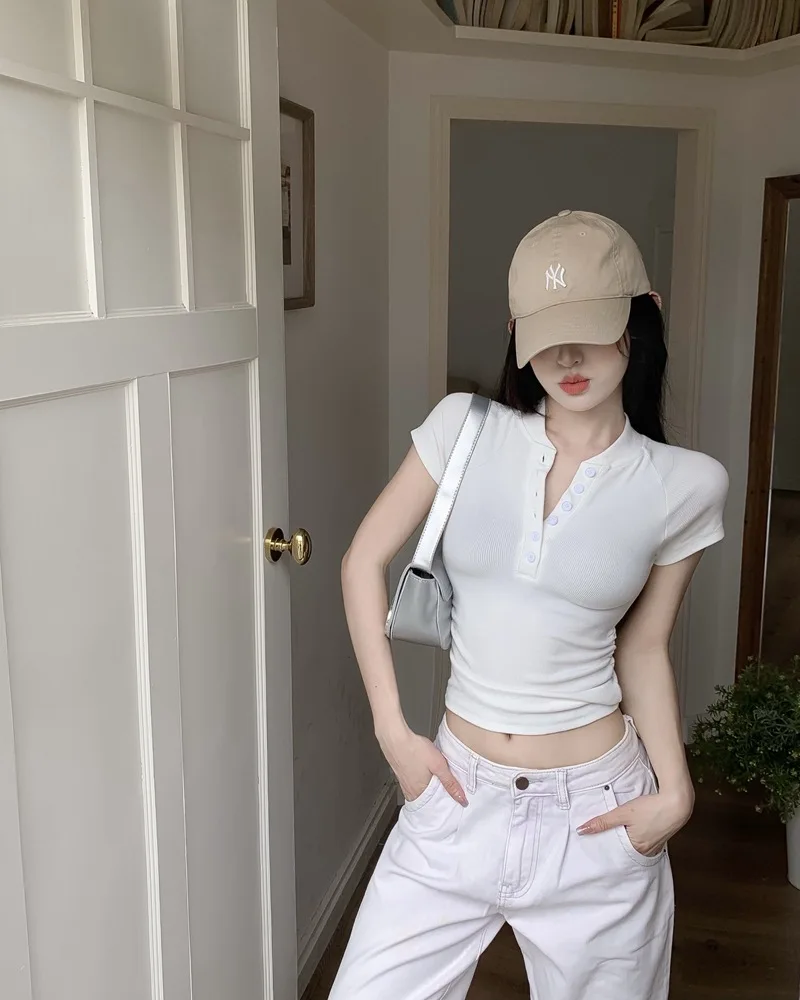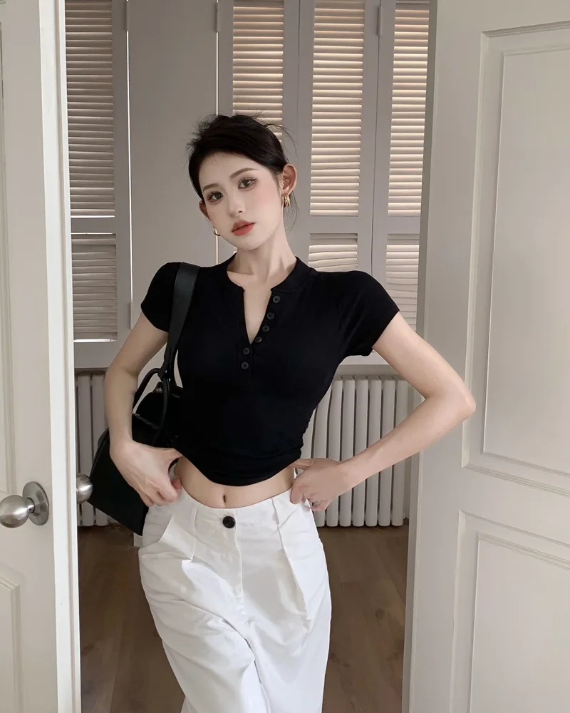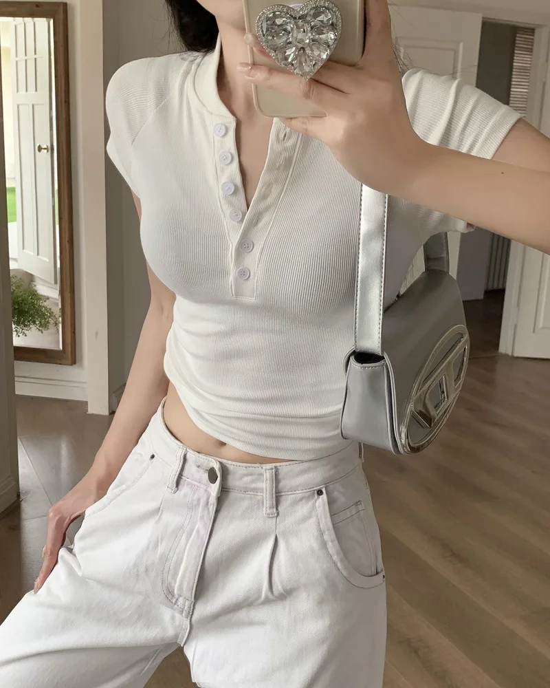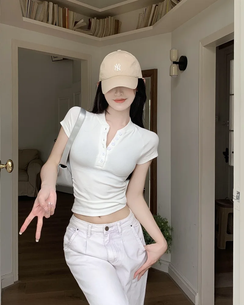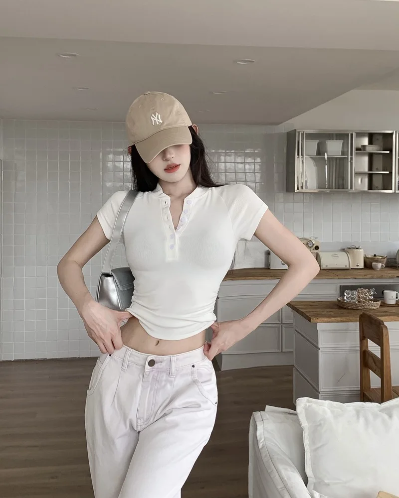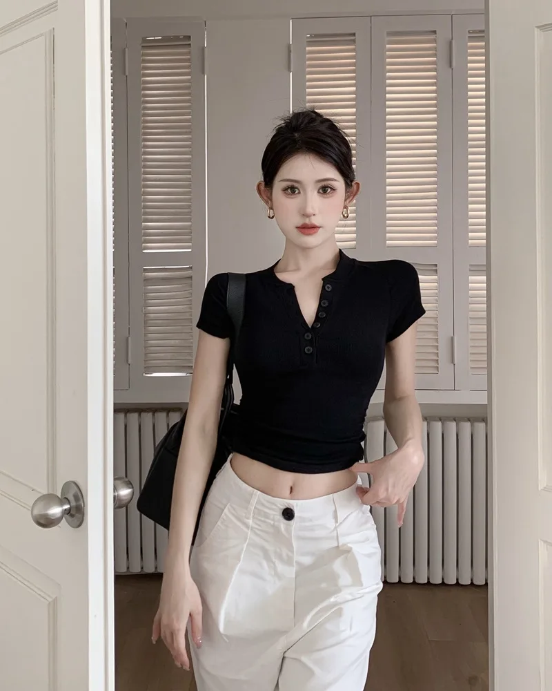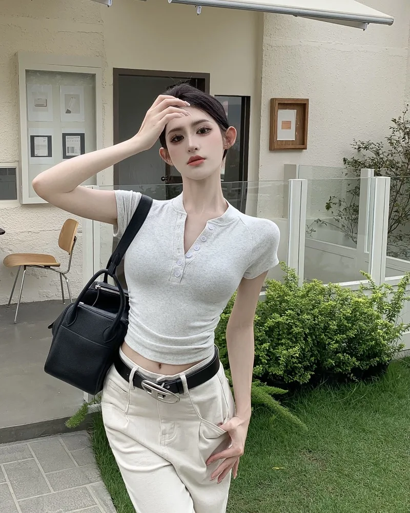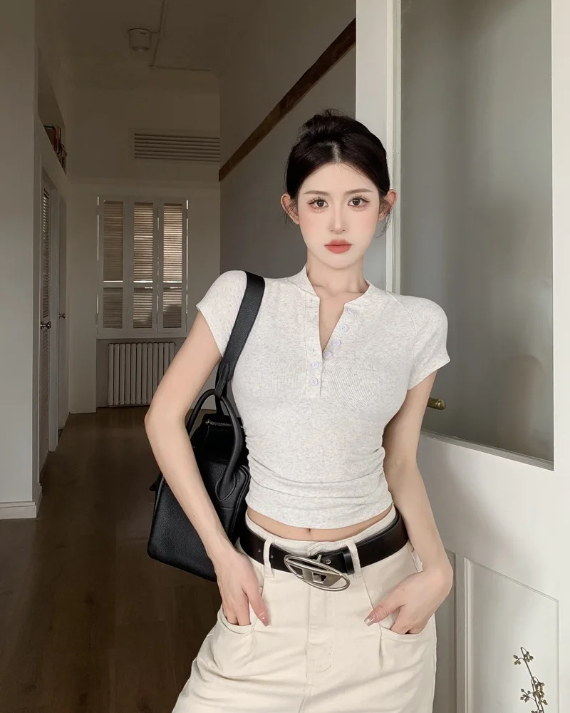1pcs Summer Women T-shirt Girl Button Half Open Collar Tee Shirt Lady Short Sleeve Slim Fit Top Women’s Fashion Trend Casual Tee
