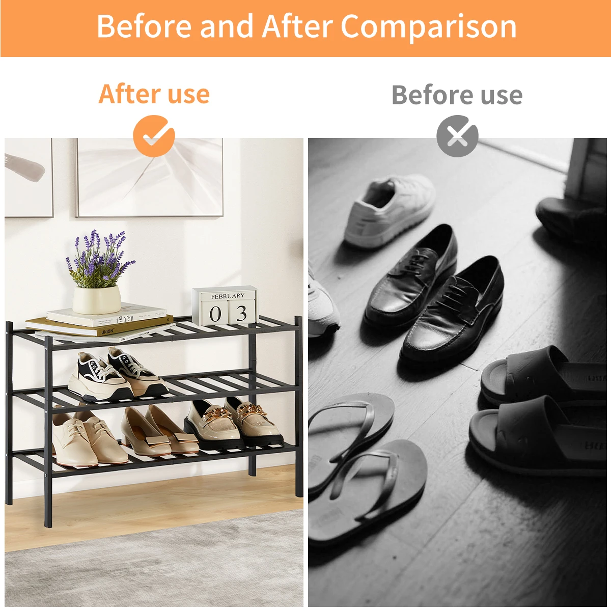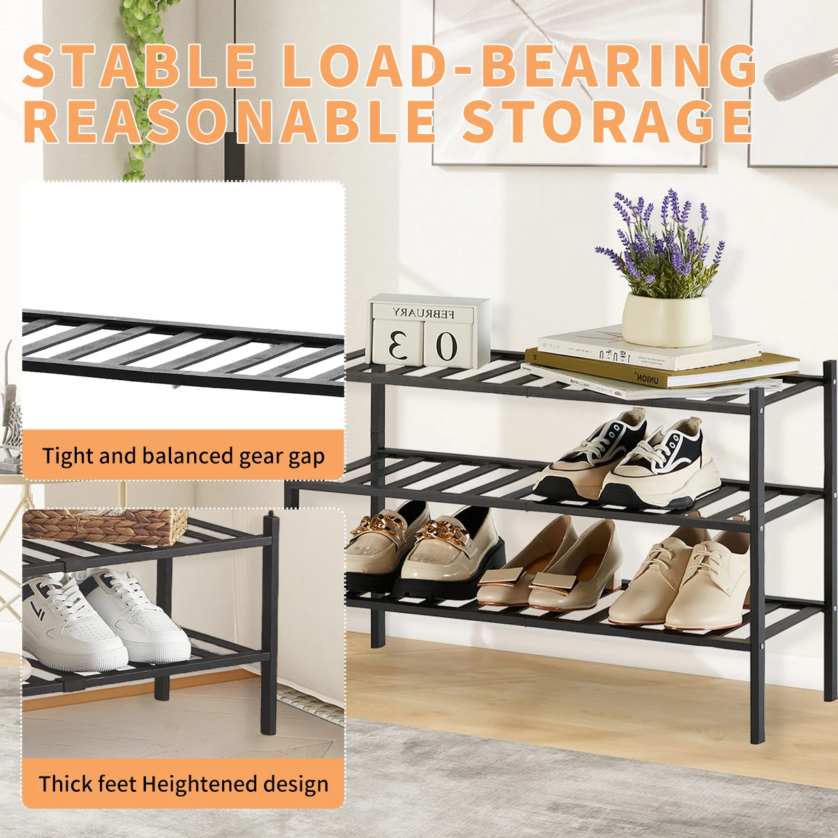 2/3-Tier Bamboo Shoe Rack with Free Shoe Horn | Reinforced Stackable Design | Small Space Storage for Entryway & Closet (Black)
