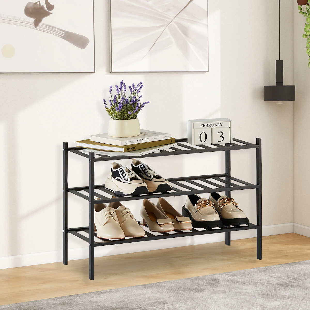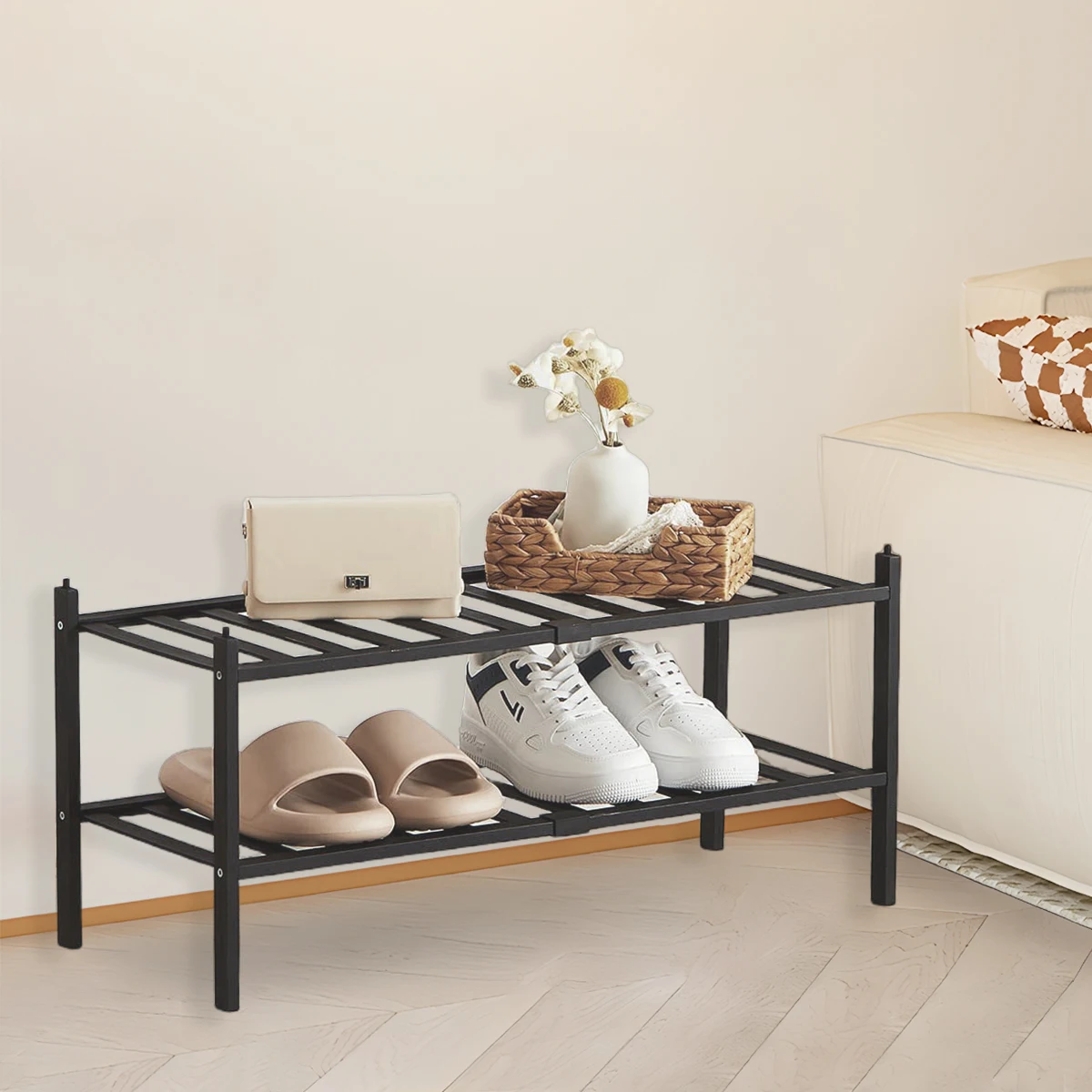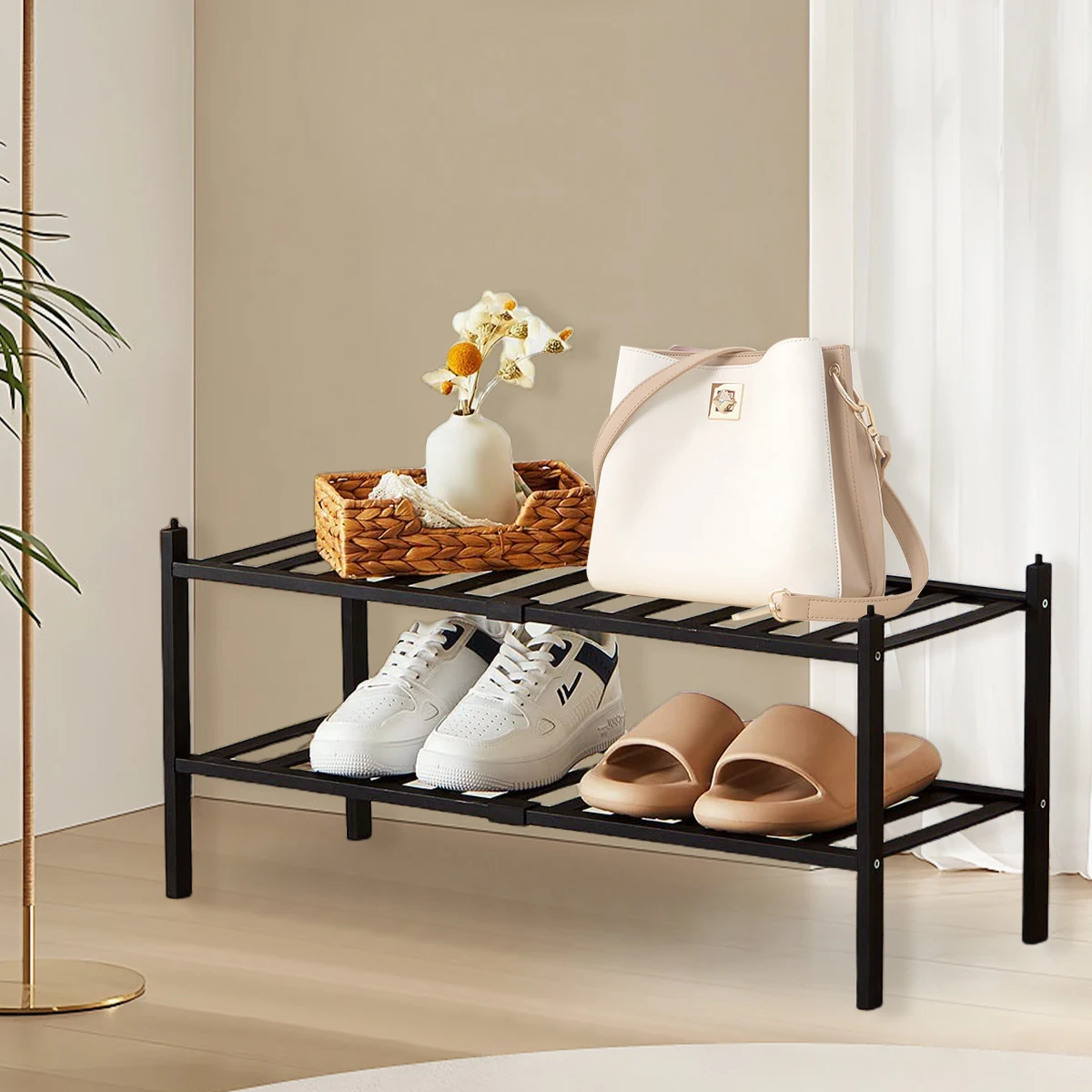 2/3-Tier Bamboo Shoe Rack with Free Shoe Horn | Reinforced Stackable Design | Small Space Storage for Entryway & Closet (Black)