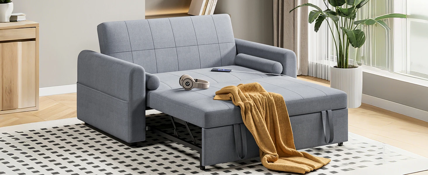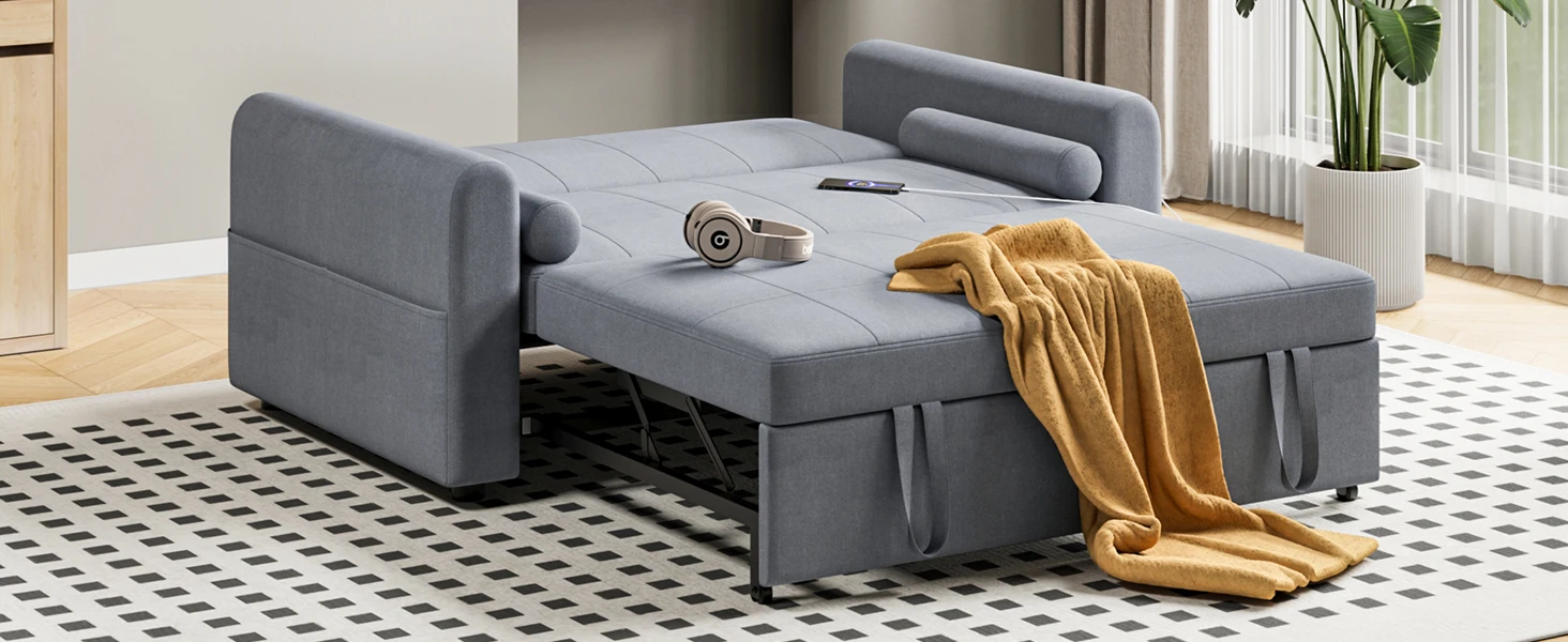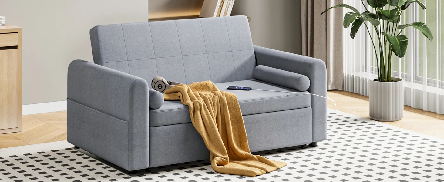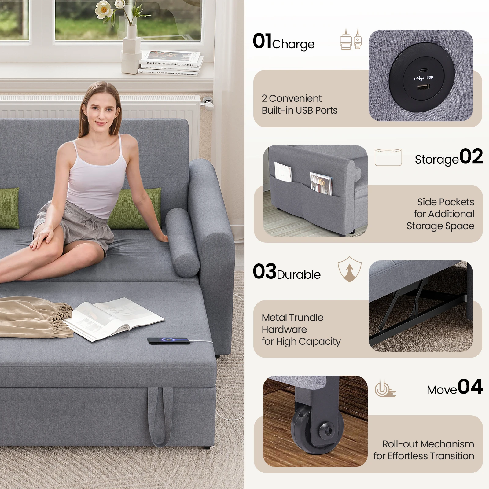 2 Seater Sofa Bed, 3-in-1 Convertible Pull Out Sleeper Sofa with 3-Position Adjustable Backrest, Side Pockets and USB