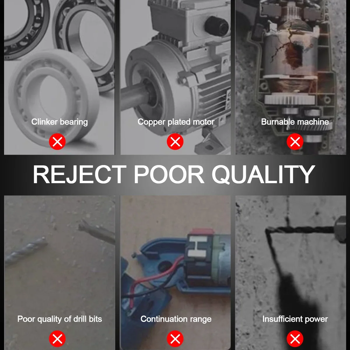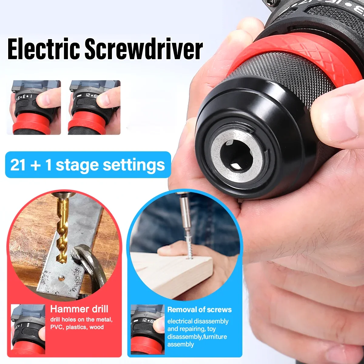 – Powerful electric drill can provide up to 50N.M torque, 25+3 position clutch can better adjust torque accuracy. 2 No-load Speed transmission (0-450 and 0-1450 RPM) for a range of drilling tightening or unscrewing screws on wood, metal and plastic. 3 in 1 working mode (Hammer, Driver, Drill).