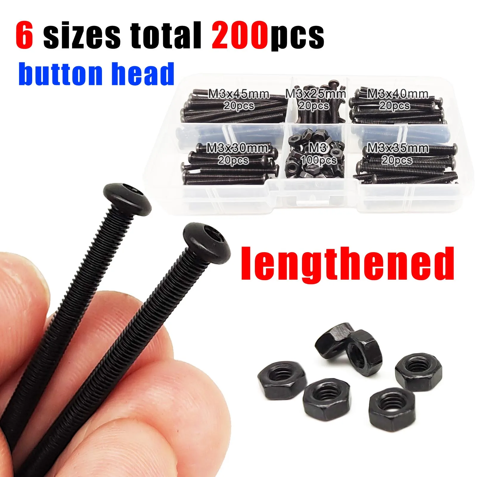 200pcs/box Long M3 Allen Hexagon Hex Socket Head Cap Button Countersunk Flat Thin Screw Bolt Nut Mix Set Kit Black Alloy Steel