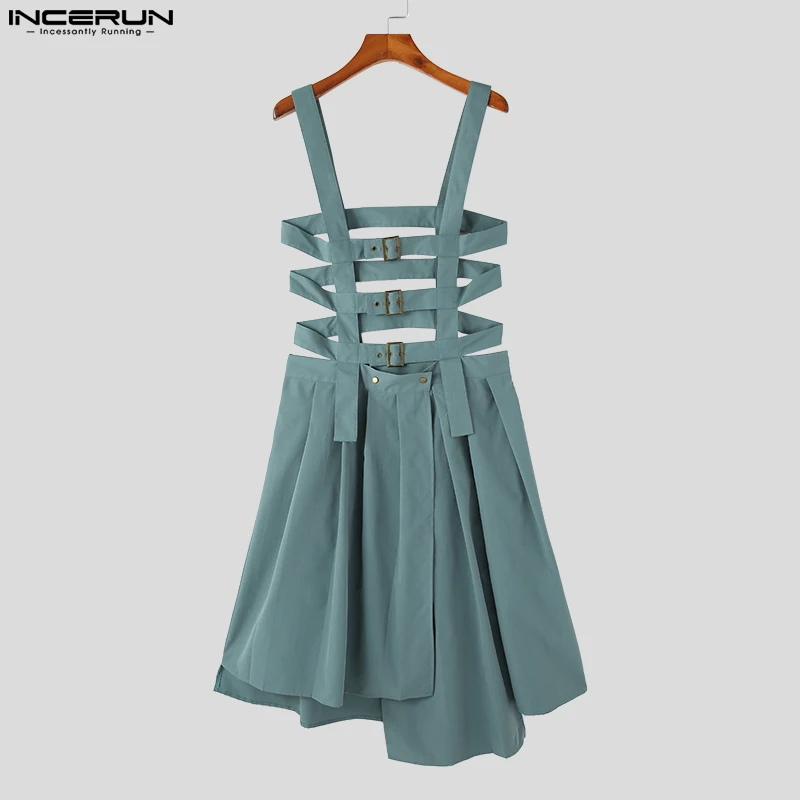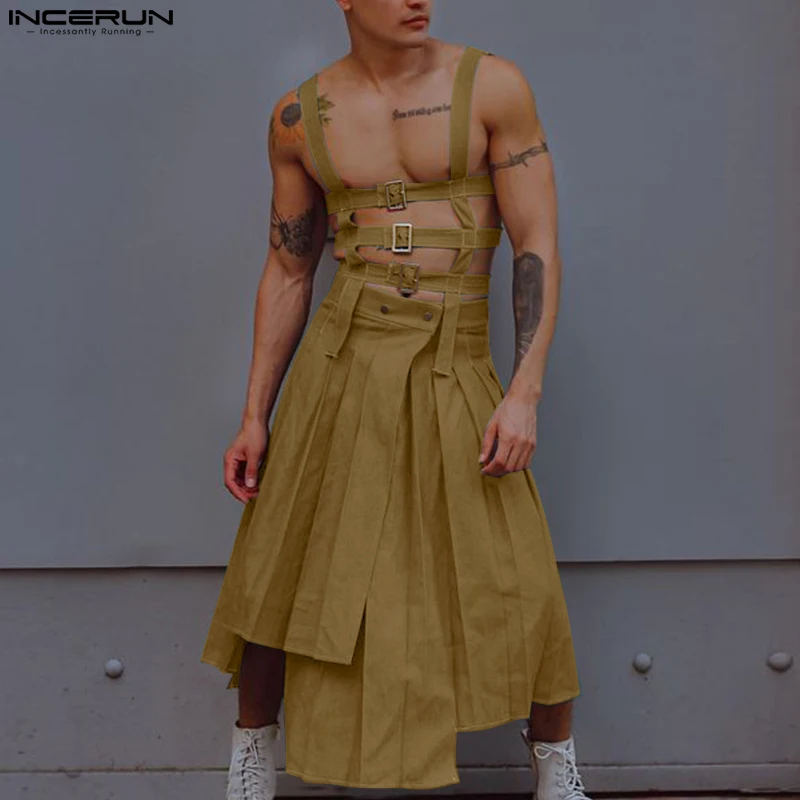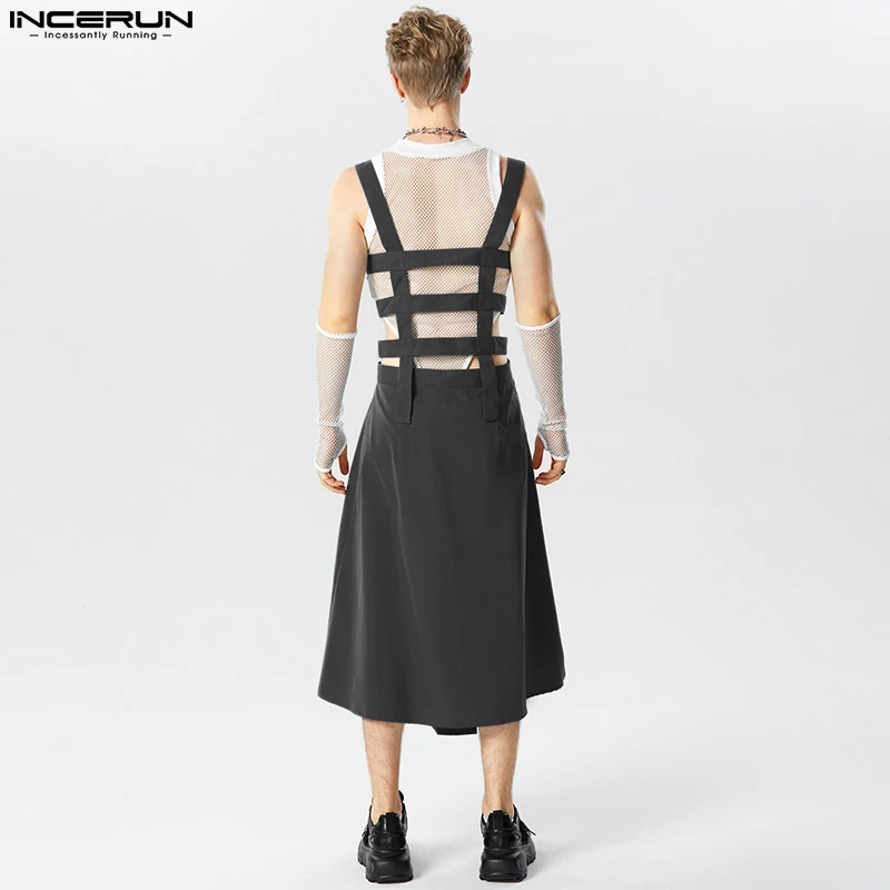 2023 Men Irregular Skirts Jumpsuits Solid Color Hollow Out Straps Men Pants Streetwear Personality Male Skirts S-5XL INCERUN