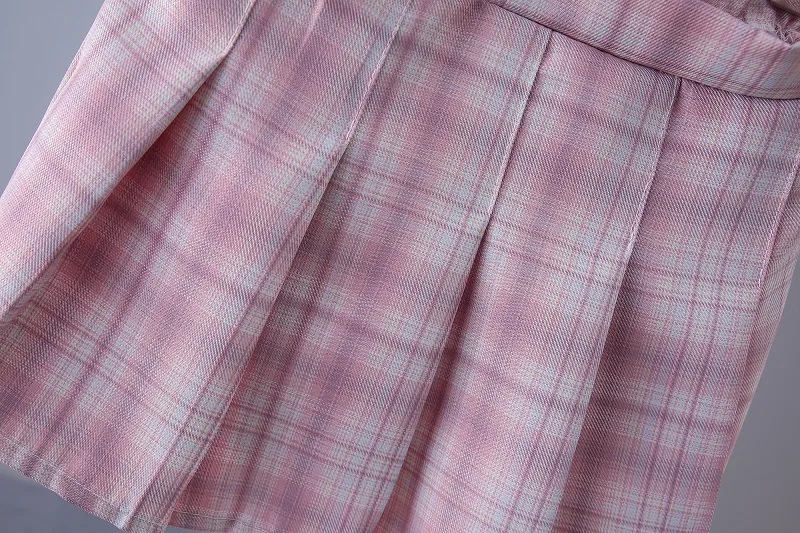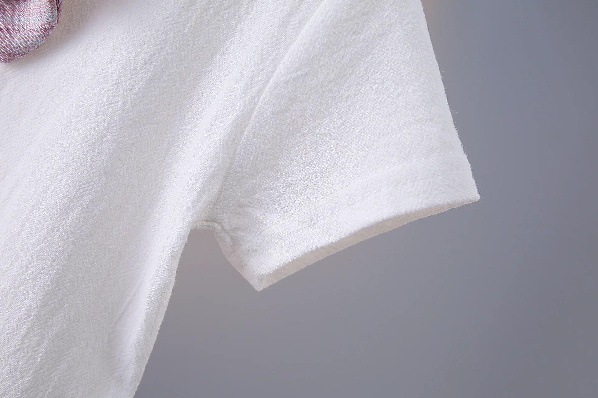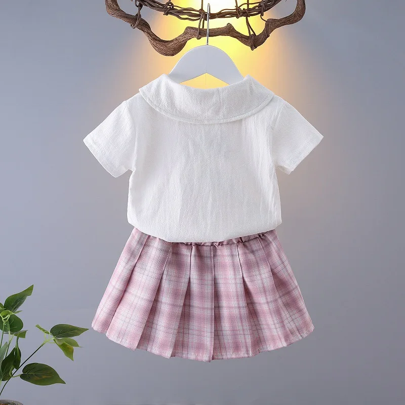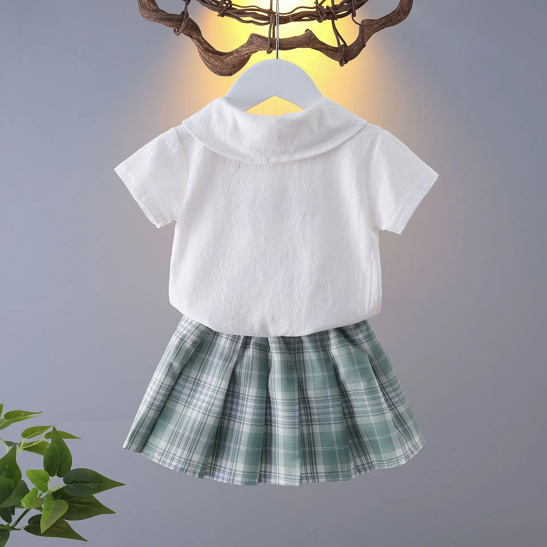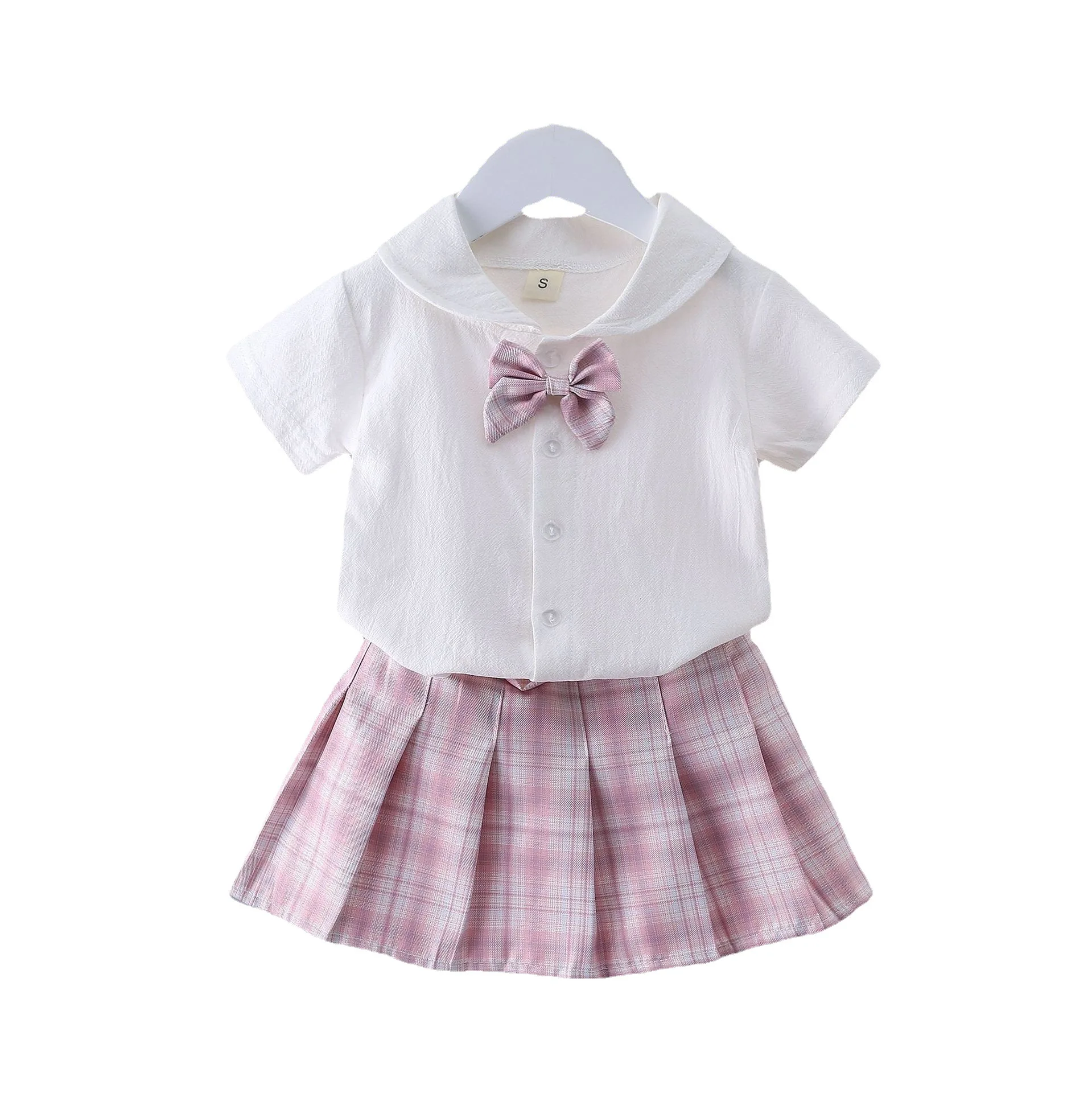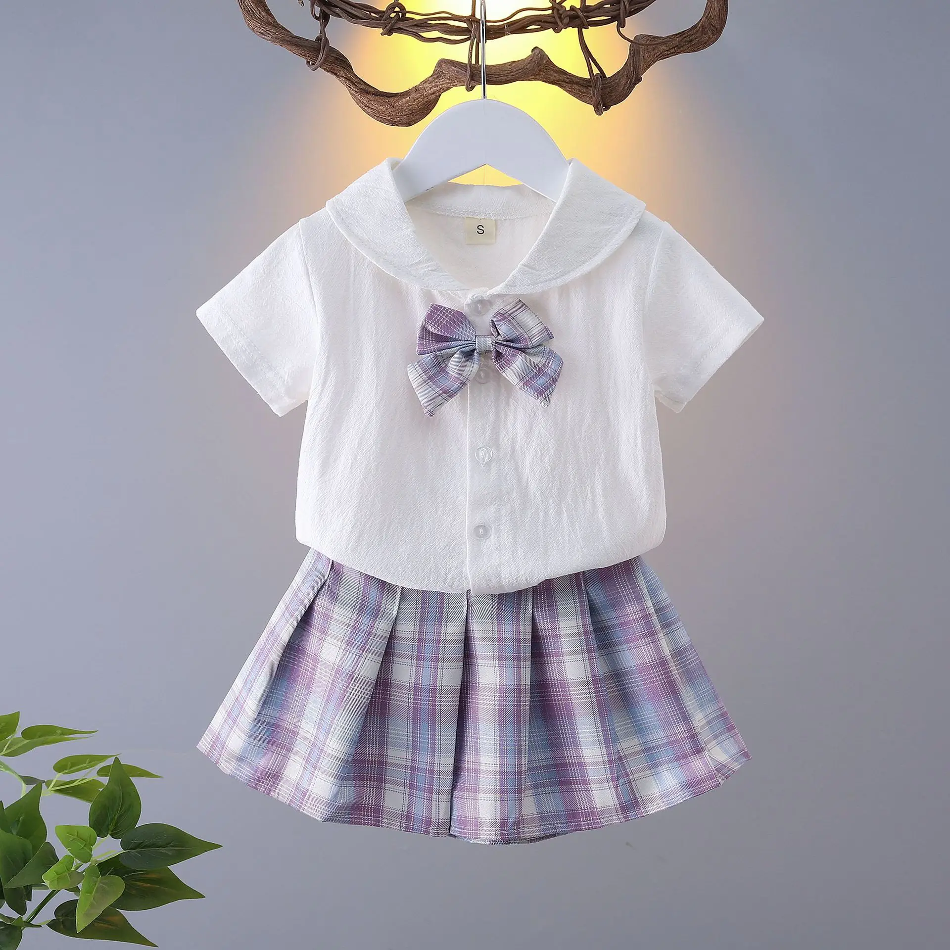 2024 summer new girls sailor short white bowknot T shirt blouse + jk plaid pleated skirt suit teenager children set 4 12 year