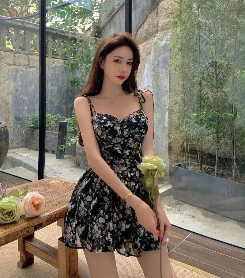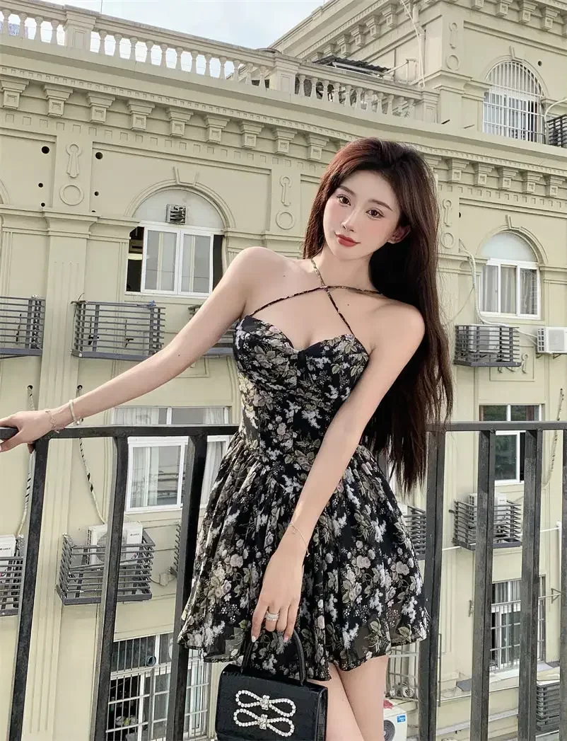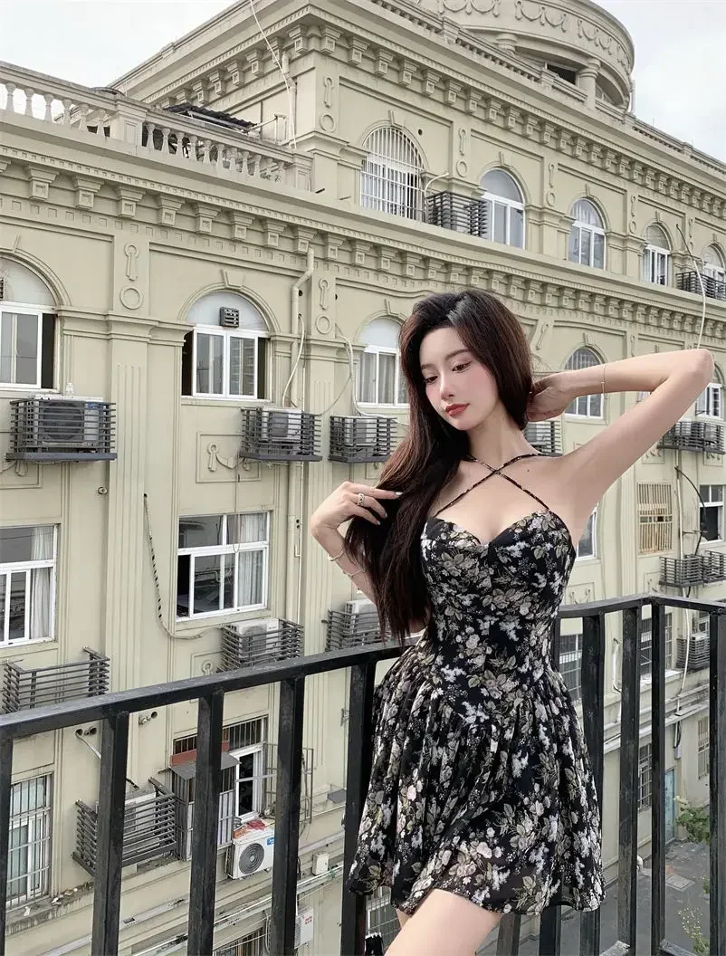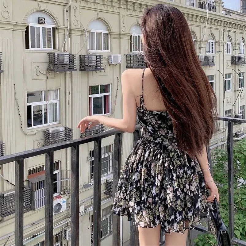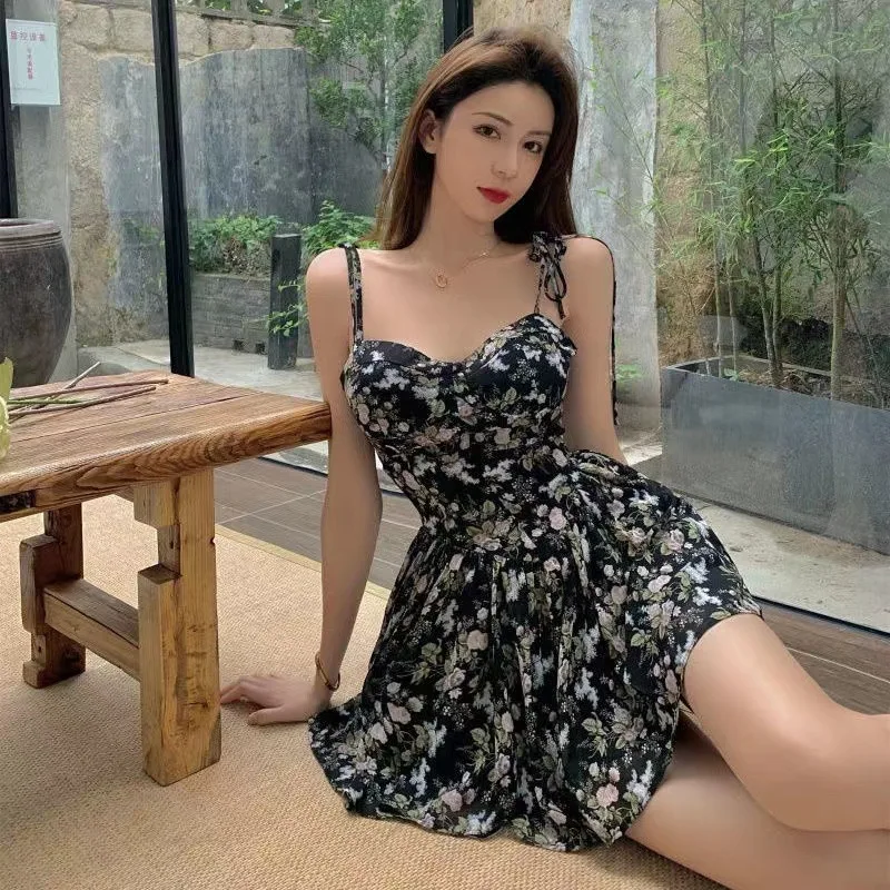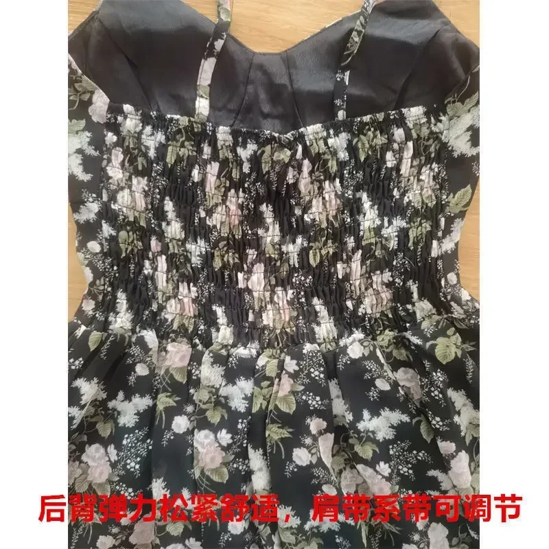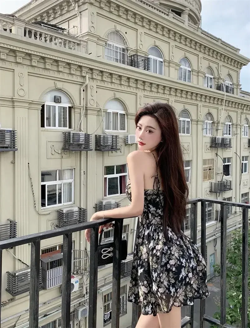 2024 Summer Versatile Fashion Dresses Women Floral French Style Retro Spaghetti Straps Lace-up Holiday Beach Dress Streetwear