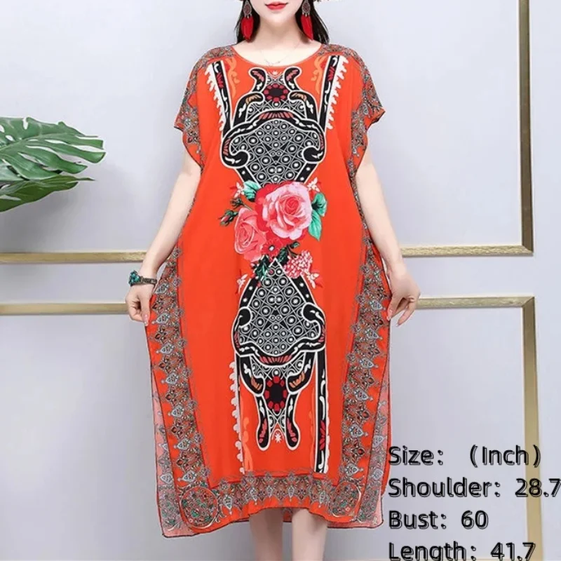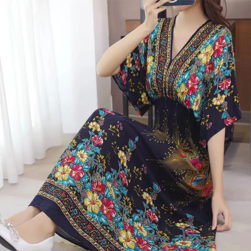 3 reviews for 2025 Summer New Casual Elegant Retro Bohemian Style V-neck Elastic Waist Large Swing Printed Long Skirt Autumn Summer Dress