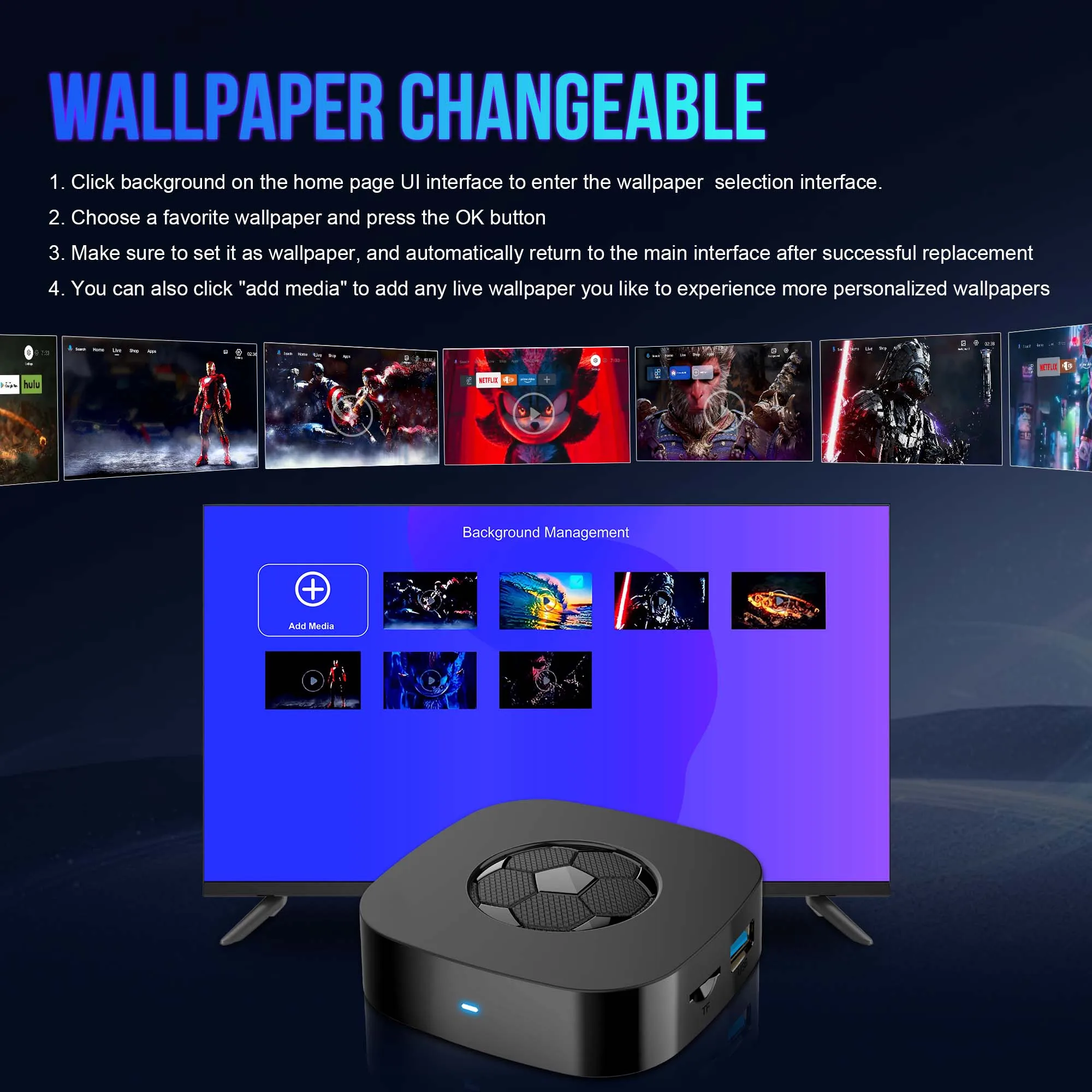 Supports custom dynamic video wallpapers in 8K ultra-high definition. Say goodbye to monotonous interfaces and instantly elevate your living room with a touch of sophistication!