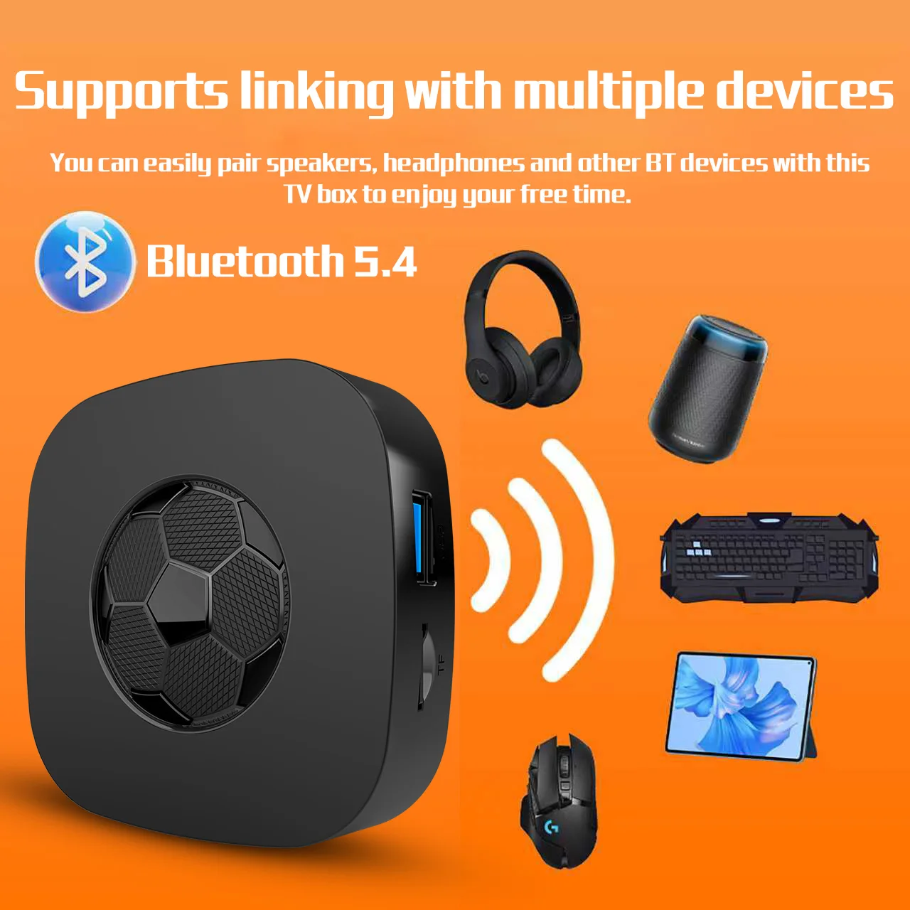 This is a multi-functional host which can be connected to Bluetooth speakers, keyboard and mouse, handles, to enjoy multimedia life.