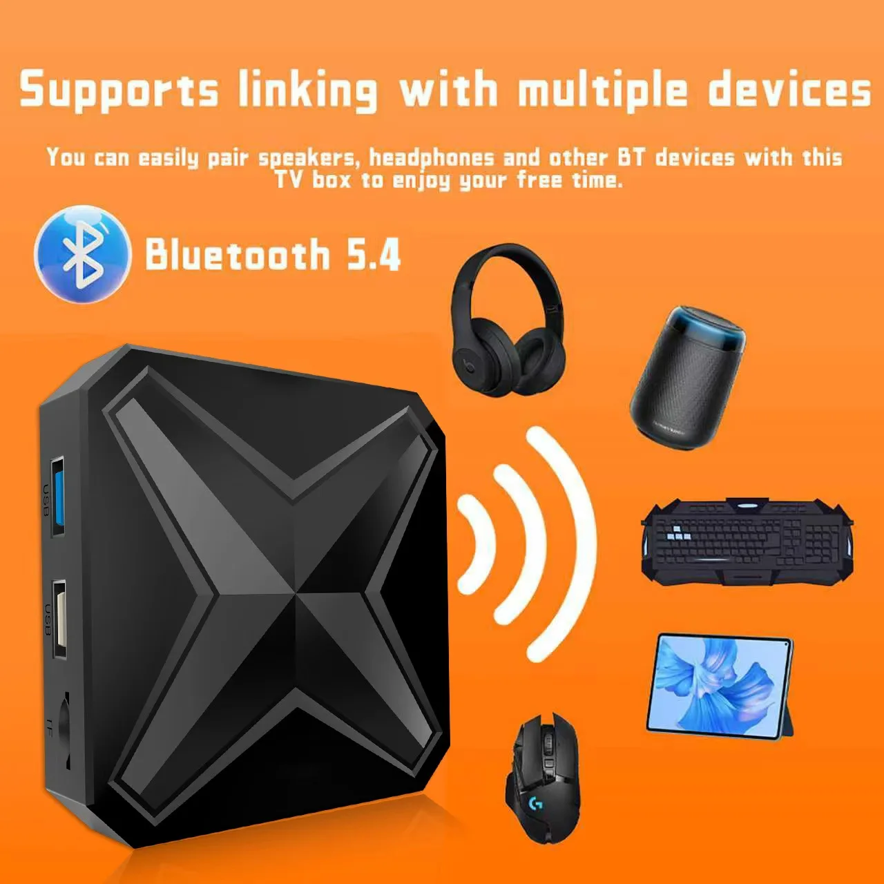 This is a multi-functional host which can be connected to Bluetooth speakers, keyboard and mouse, handles, to enjoy multimedia life.