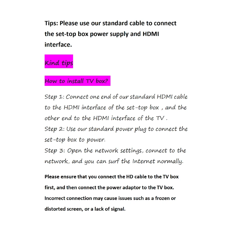 Android TV Box comes with all accessories: Android TV box , power adapter, Remote control, HDMI cable, User manual.
