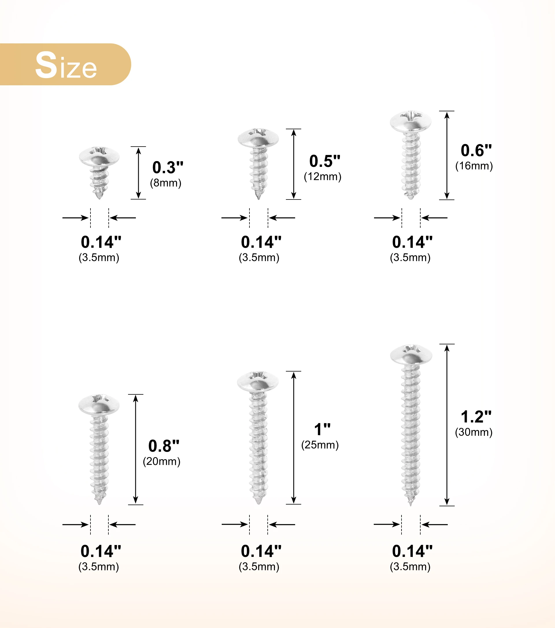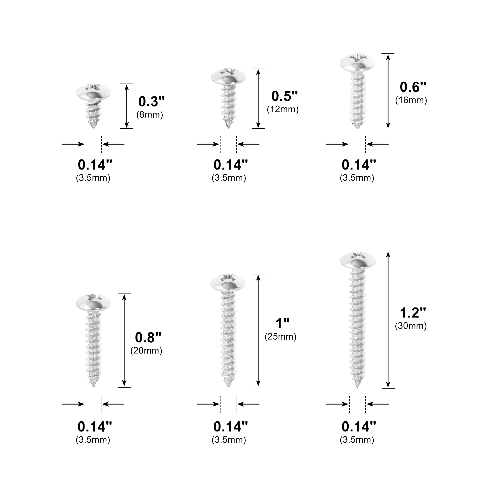 | color | Black 3.5×12, Black 3.5×16, Black 3.5×20, Black 3.5×25, Black 3.5×30, Silver 3.5×12, Silver 3.5×16, Silver 3.5×20, Silver 3.5×25, Silver 3.5×30 |