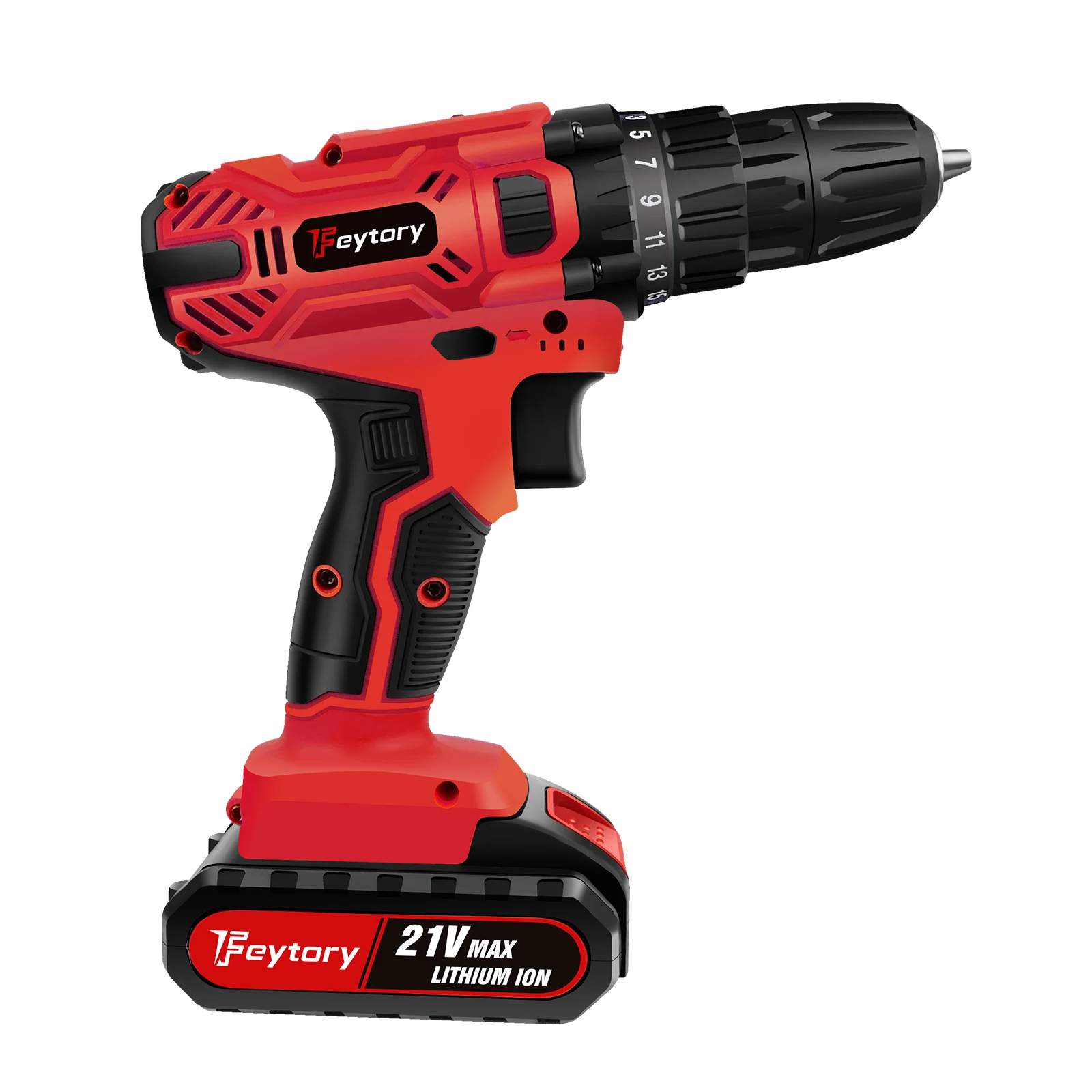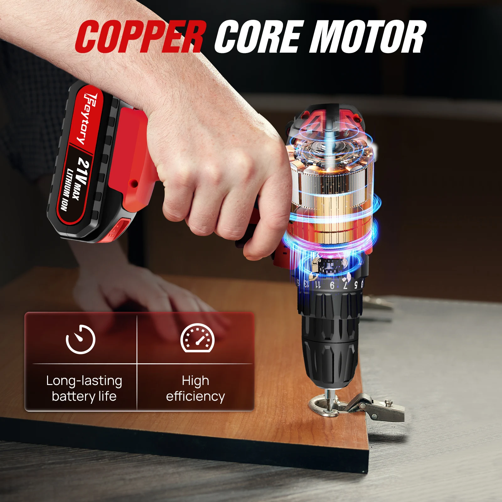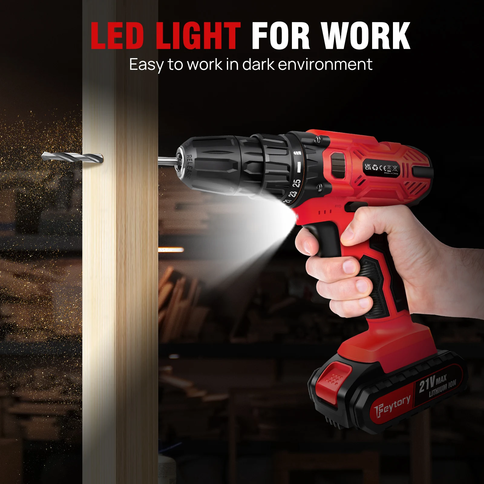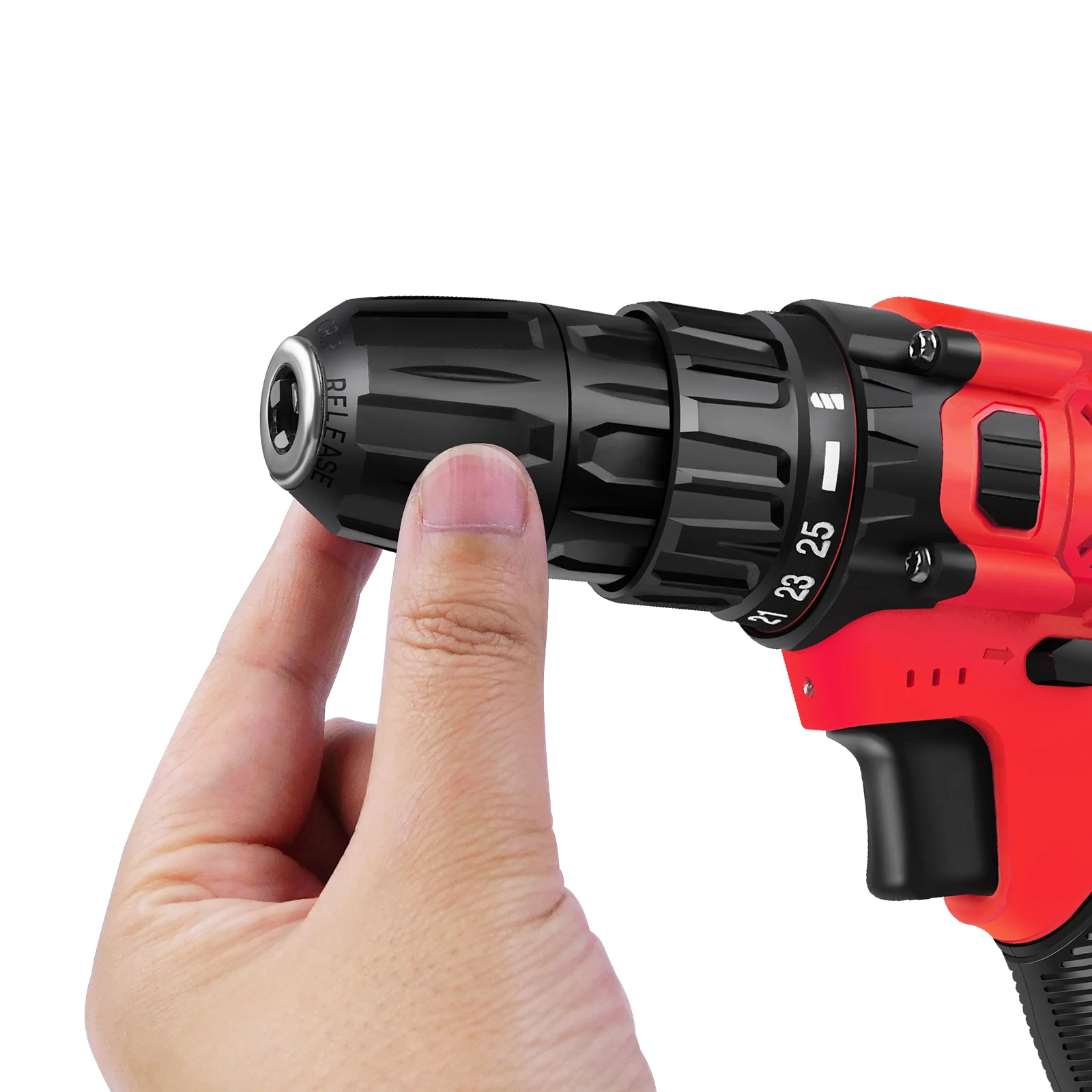 Cordless drill is powered by a high-speed motor, providing a maximum torque of 45Nm. The electric drill has 25+1 torque positions for chuck selection, providing a more accurate operation for drilling and screwing.