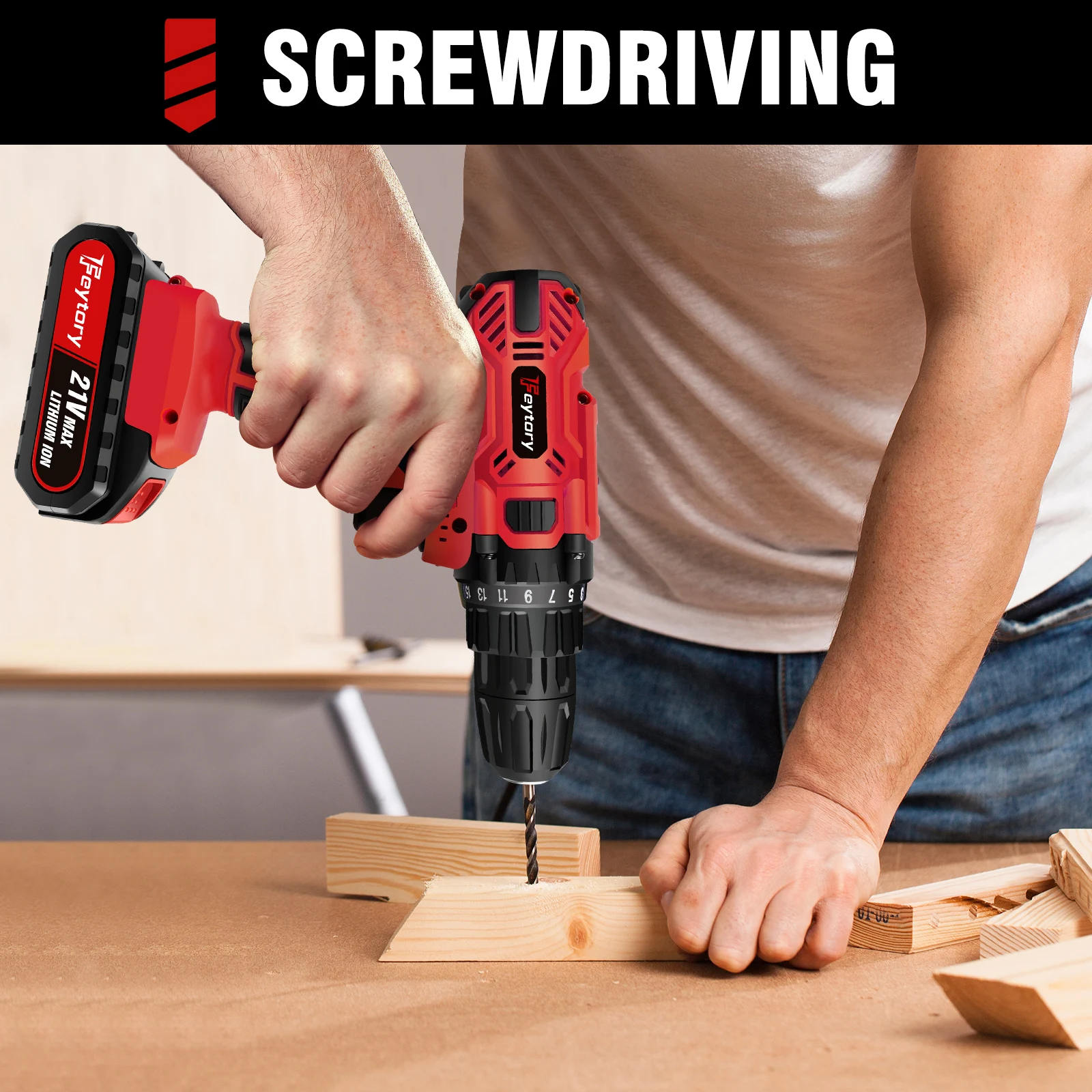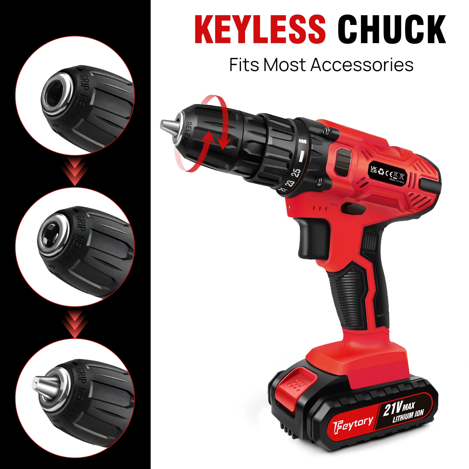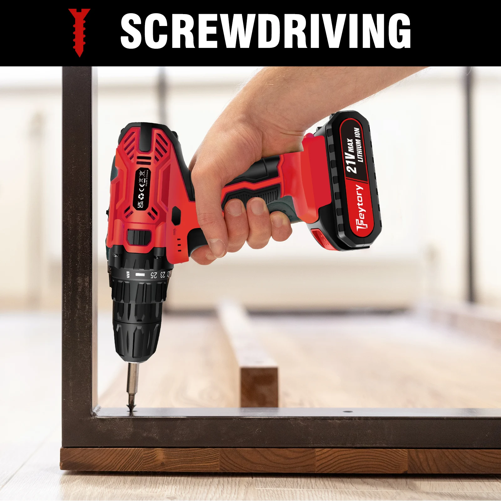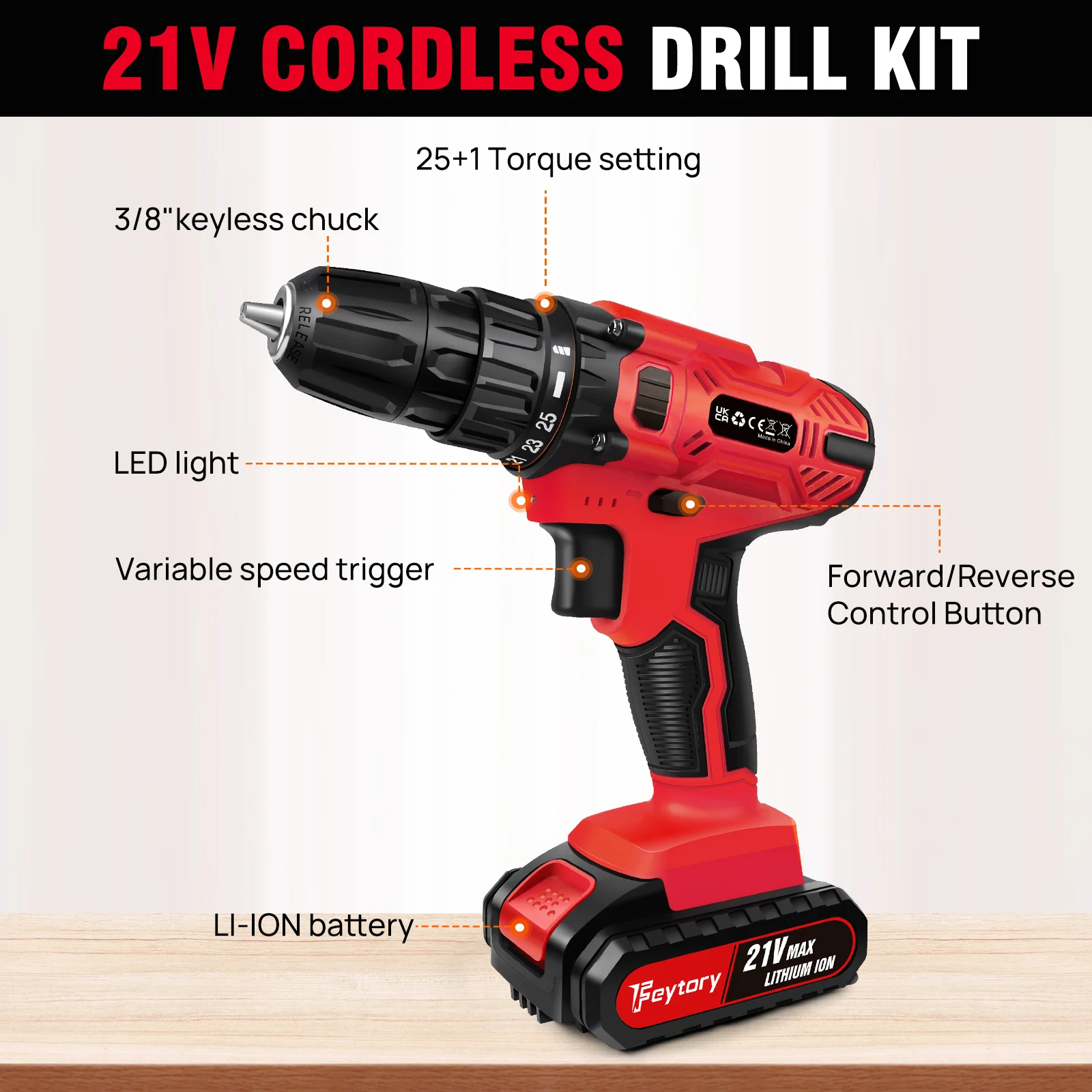 21V Cordless Power Drill,with 1500mAh Battery Electric Drill Driver 25+1 Torque 45Nm Screwdriver Kit Combi Drill 3/8″
