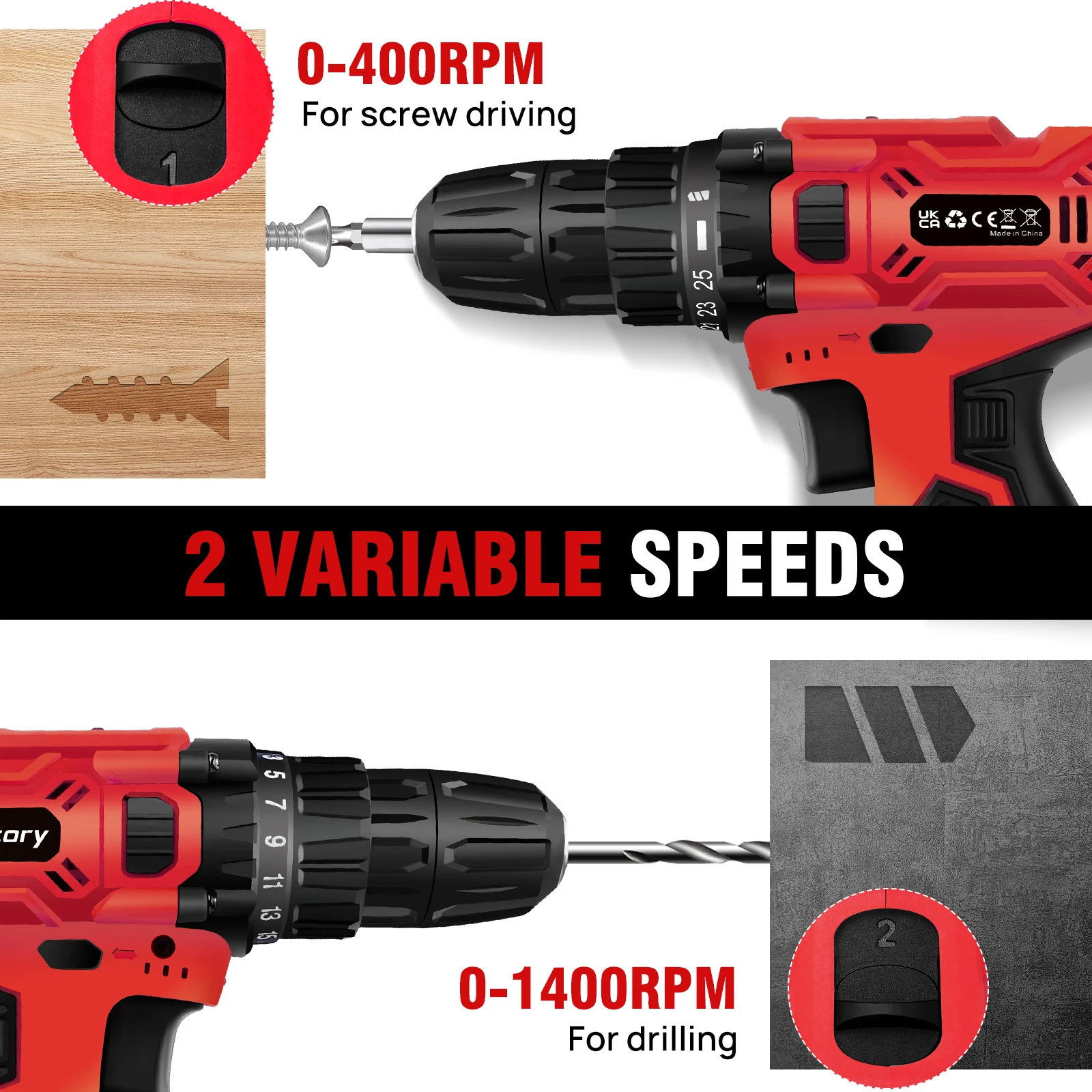 Equipped with 2 Variable Speed (0-400RPM and 0-1400RPM), the power drill fits the wide range of drilling and screw driving applications. Low speed (0-400rpm) for simply tighten or loosen the screws. High speed(0-1400rpm) for drilling wood, plastic, soft metal and other materials.