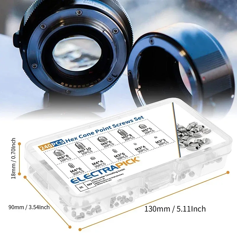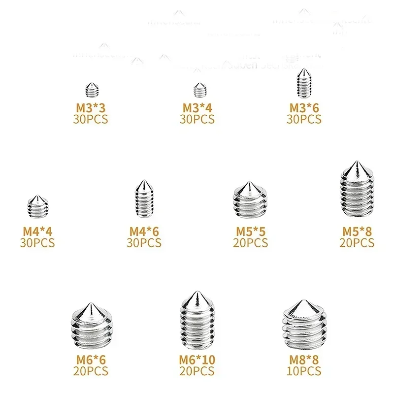 240pcs Stainless Steel Hex Socket Screw Set M3/M4/M5/M6/M8 Grub Screws with Cone Point & Tapered End Durable Fasteners
