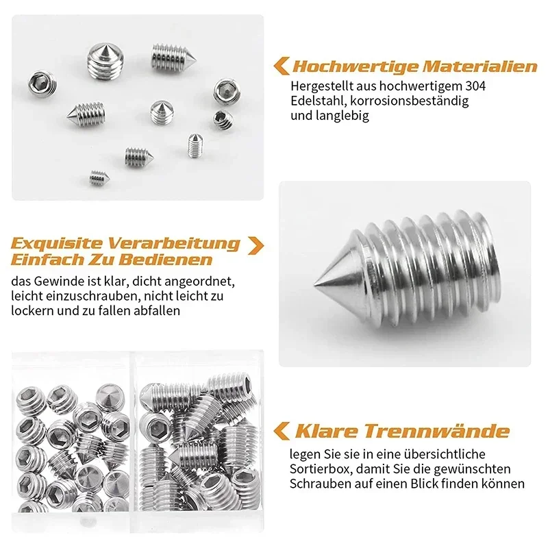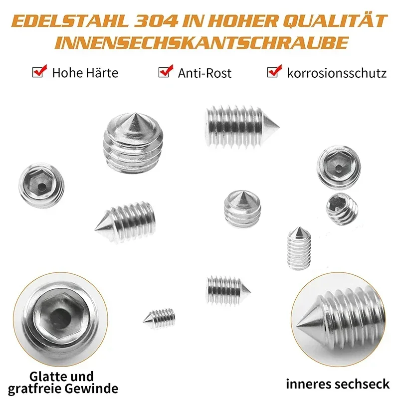 Excellent workmanship: grub screw set made of high quality 304 stainless steel, durable, with excellent anti-rust and corrosion resistance.