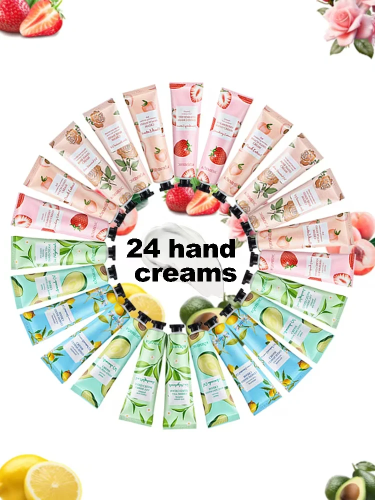 24PCS hand cream, with 6 different flavors including rose, strawberry, peach, etc., moisturizes and nourishes hands, preventing dryness and cracking in autumn and winter, and providing daily skincare care