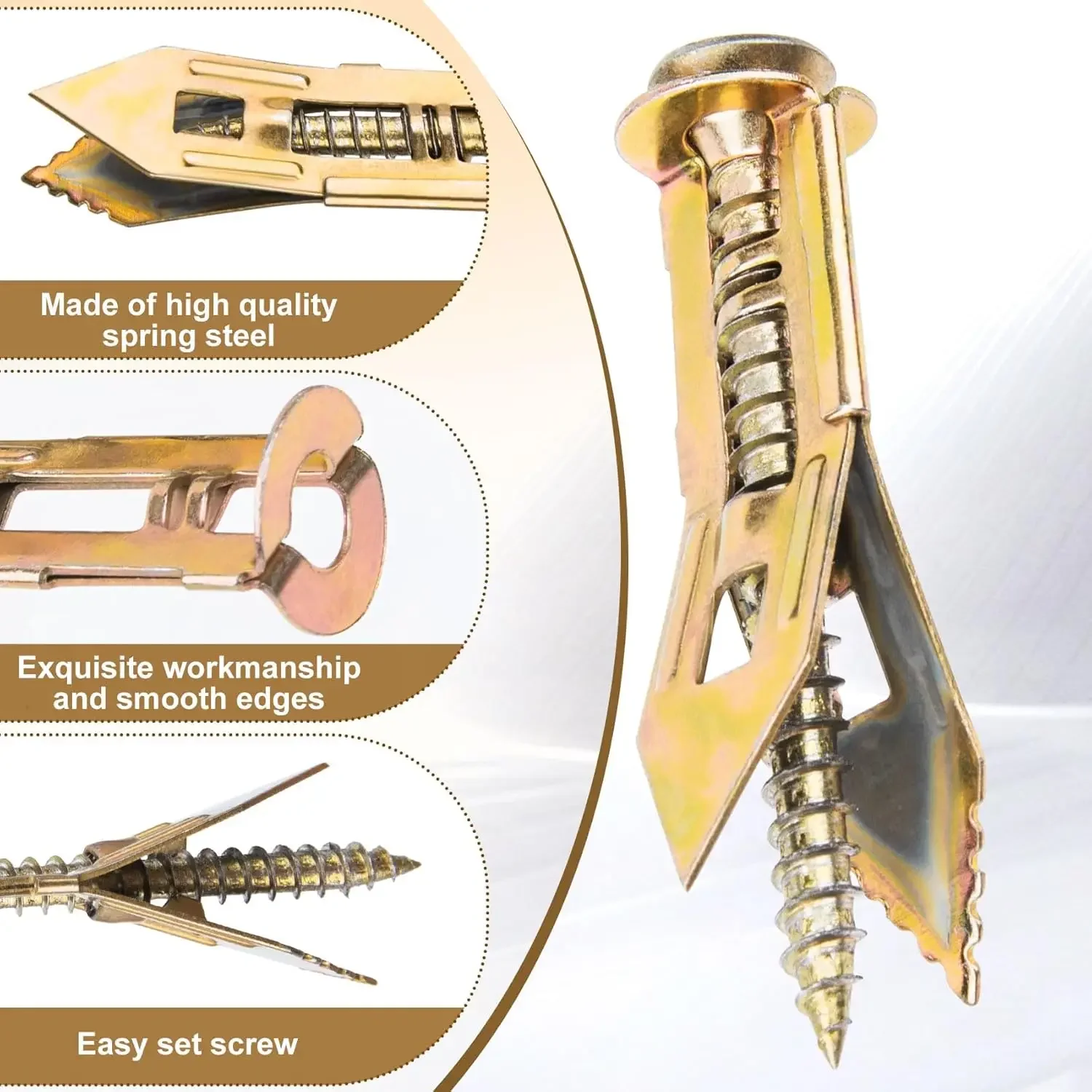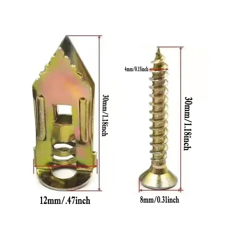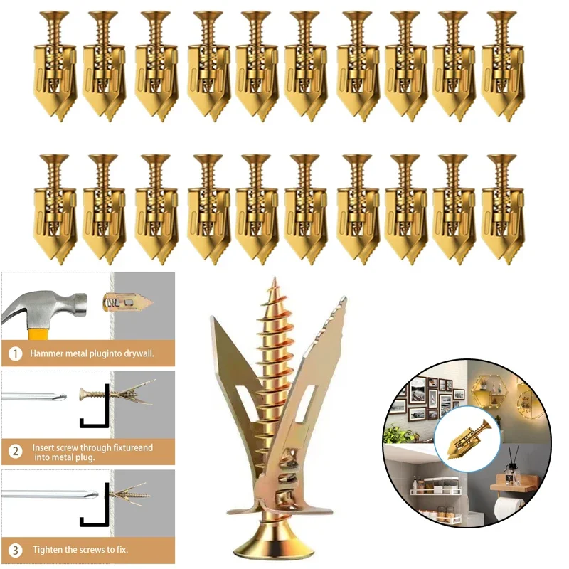 Quality Material: These anchors and screws are made of quality steel with a zinc plated finish. They are strong and stable, and not likely to deform or get damaged easily. With an expanding design, when you tighten the screw, the two sides expand relative to each other, providing a very stable holding power. This means they can serve you well for a long time