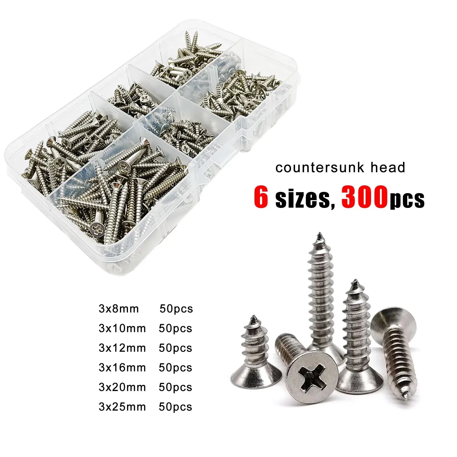 250/300pcs Mix M3 Assortment Set Kit Phillips Flat Countersunk Round Pan Head Self Tapping Wood Screw 304 A2-70 Stainless Steel
