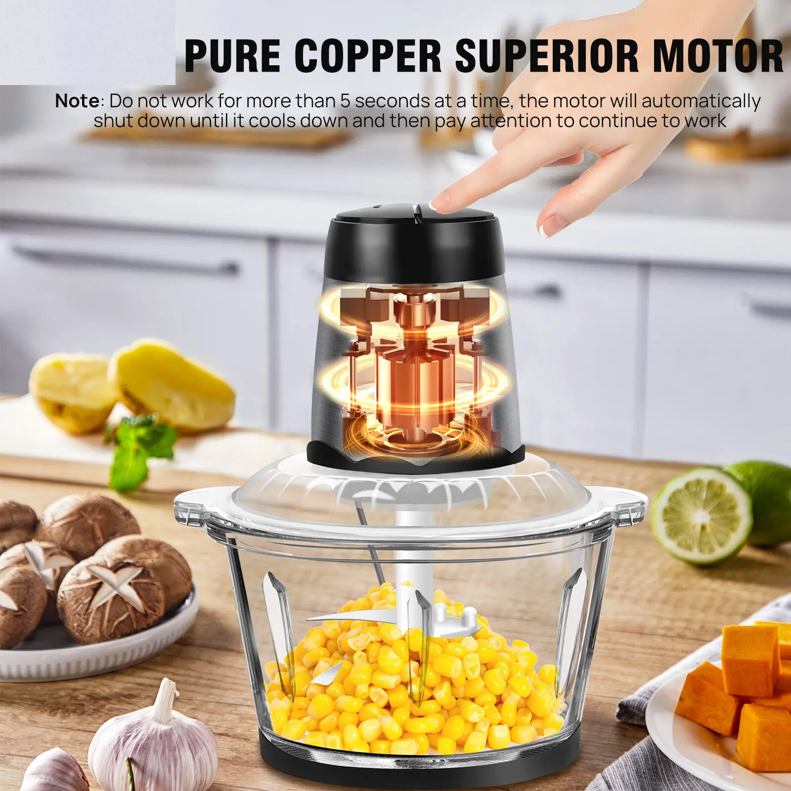 【VERSATILE GLASS BOWL】The inclusion of a durable glass bowl enhances the functionality and aesthetic appeal of the Mini Chopper. The 1L capacity provides ample space for processing ingredients, while the transparent design allows you to monitor the progress as you chop. Its versatility extends beyond chopping, as it can also be used for serving or storing prepared ingredients.