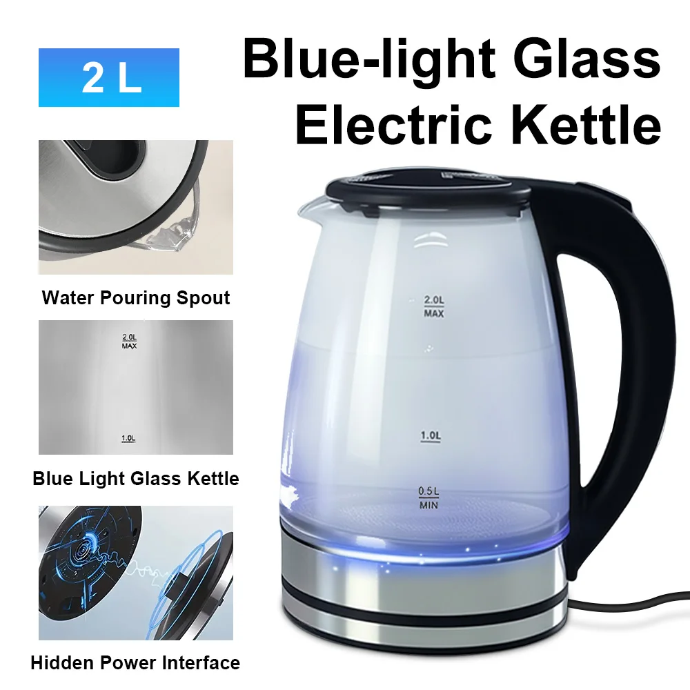 2L Electric Kettle Glass Fast Boil Blue LED household appliance With Stainless Steel Fast Boiling Portable Jug Auto Shut-off