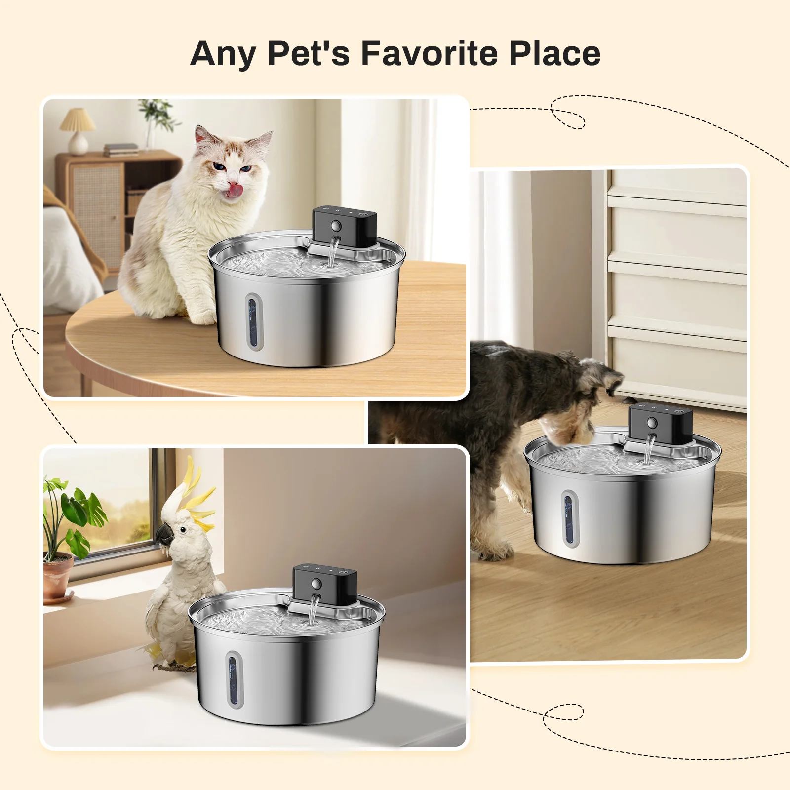 【Stainless Steel Material – BPA Free】Compared with plastic materials, our pet water dispenser made of stainless steel metal has no BPA risk, is more durable, corrosion-resistant, and has a longer service life. No other material elements will penetrate into the water, ensuring the safety of pet drinking water.