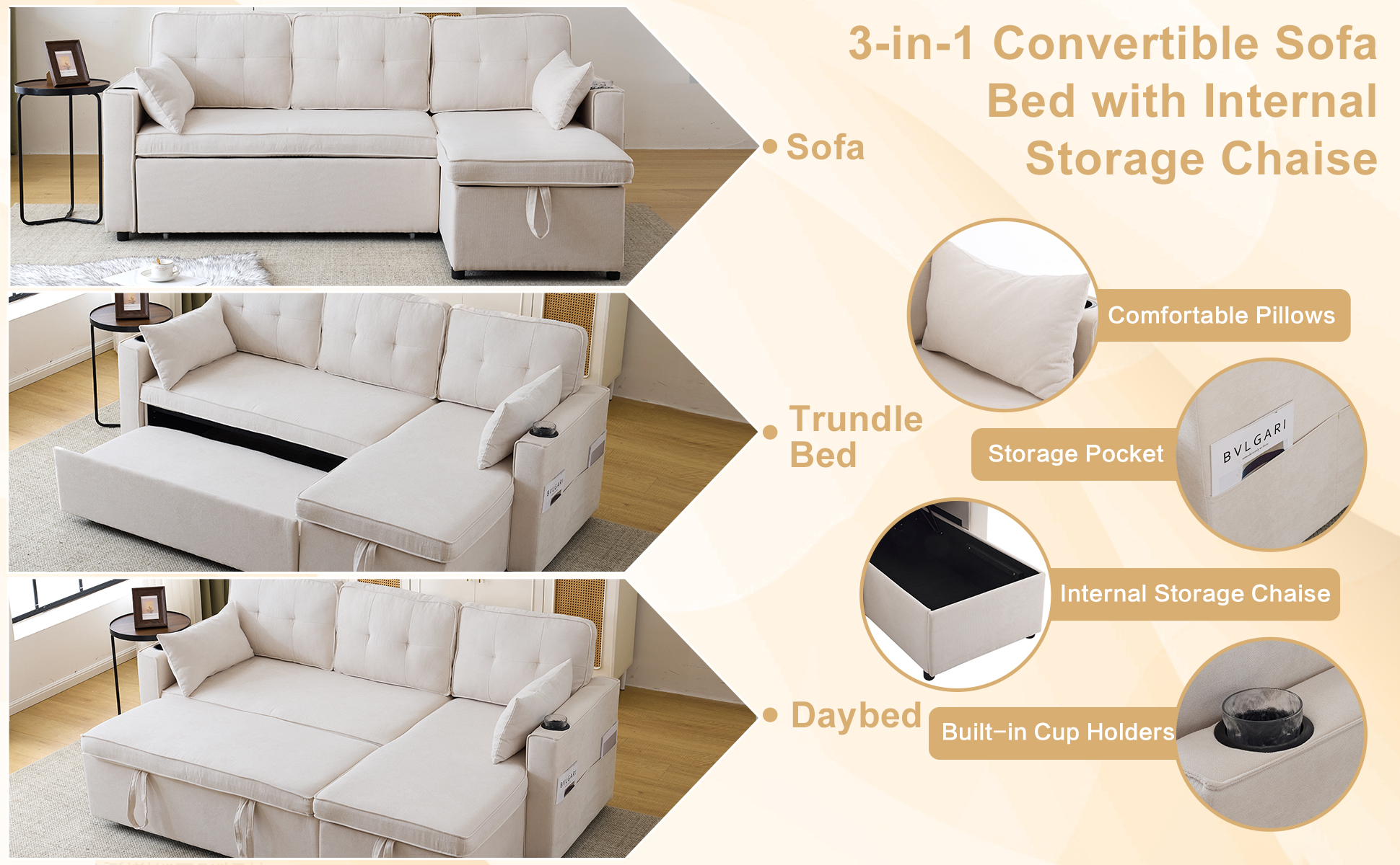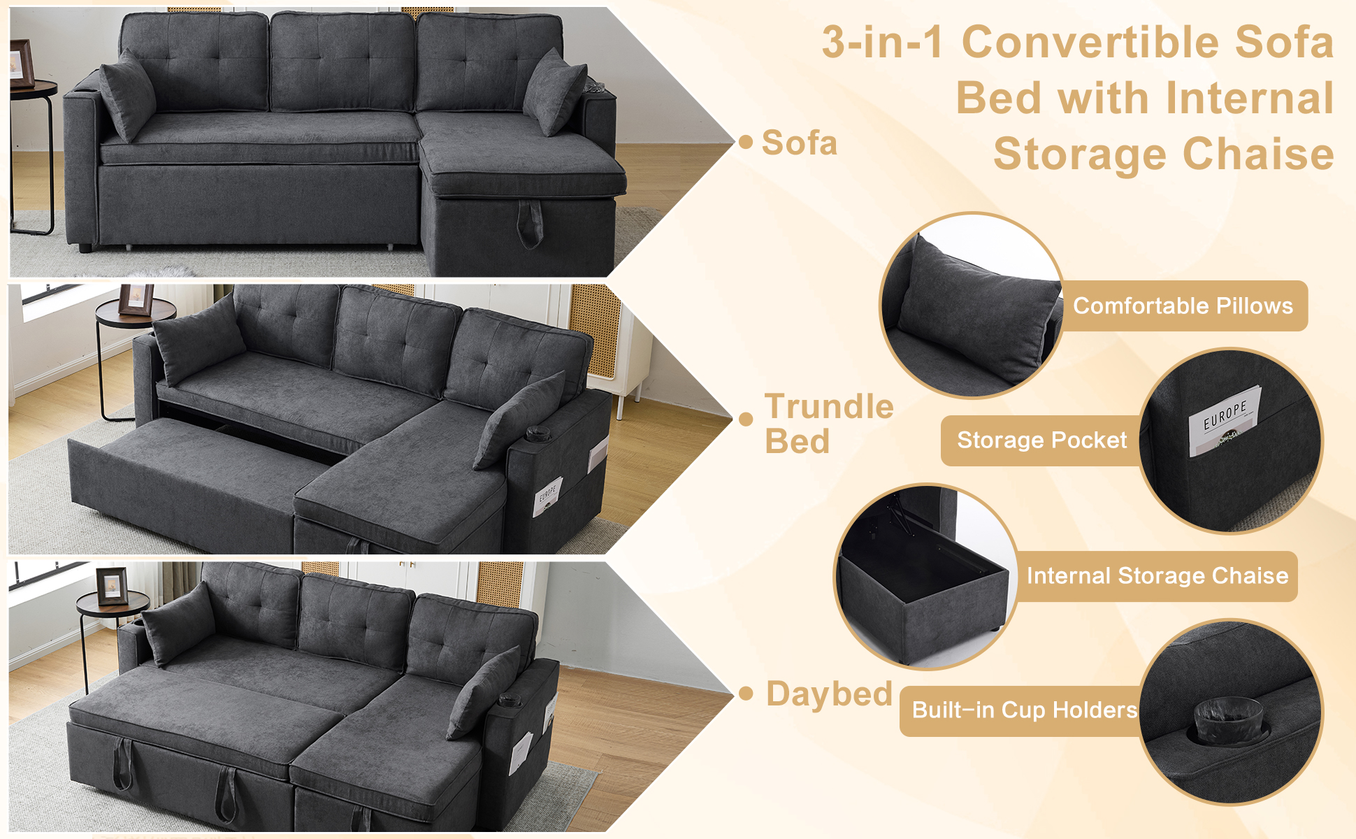 3-in-1 Convertible Sofa Bed with Internal Storage Chaise,L Shaped Sleeper Sofa Couches with Cup Holders,Pillows,Storage Pocket