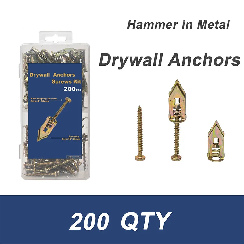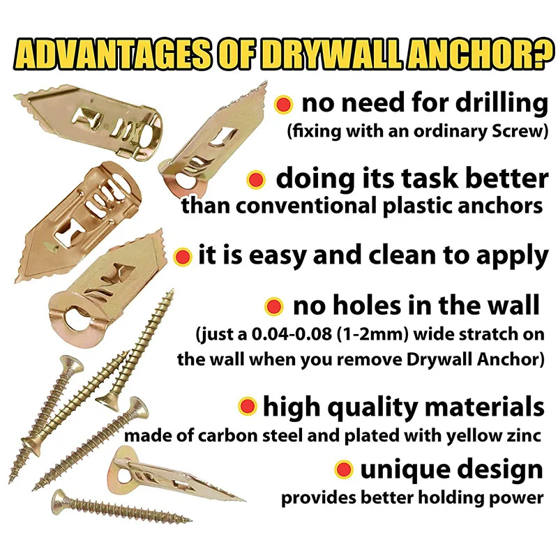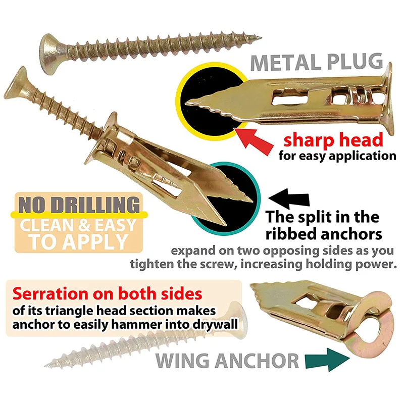 No drilling : Clean&Easy the split in the to apply expand on two opposing sides as you ribbed anchors tighten the screw,increasing holding power.Serration on both sides of its triangle head section makes anchor to easily hammer into drywall.