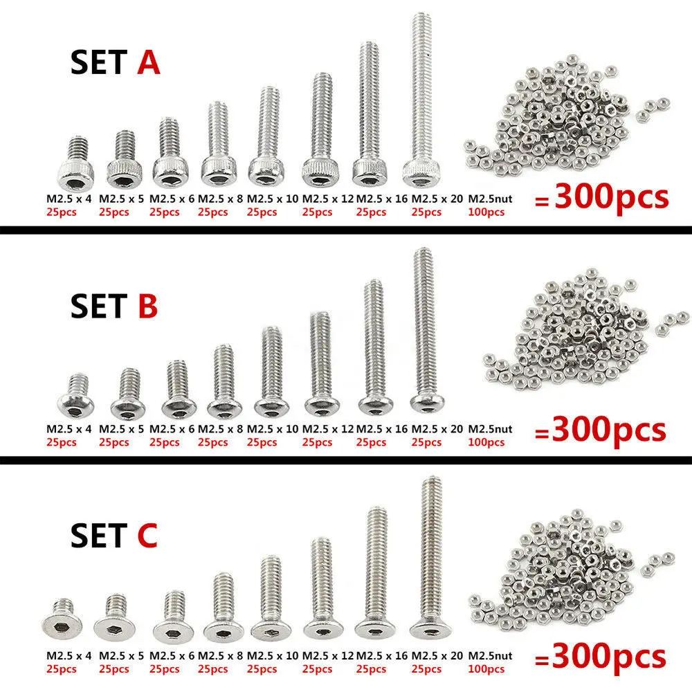 300pcs M2.5(2.5mm) Stainless Steel Screws Bolt With Hex Nuts Assortment Tools